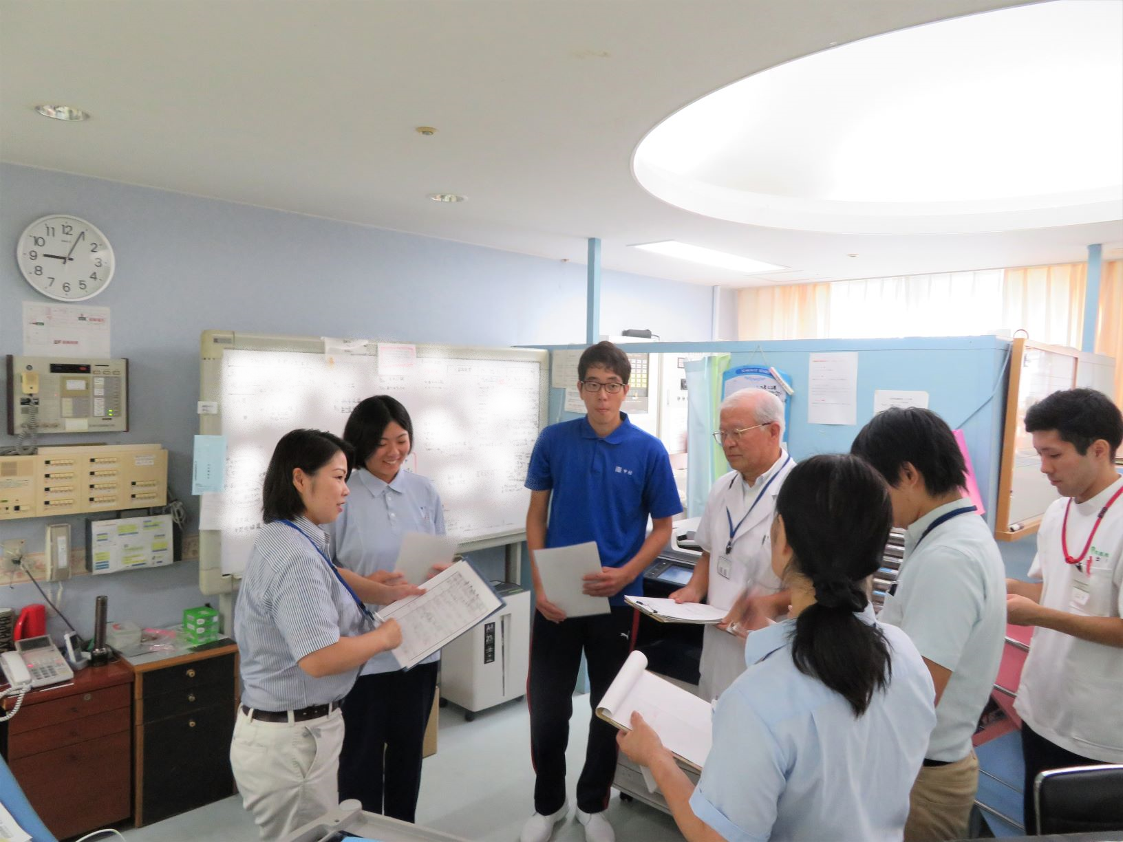 (写真右)南さつま市の介護老人保健施設ラポール吉井では、生徒2名が朝のミーティングで堂々と初日の挨拶をしていました。