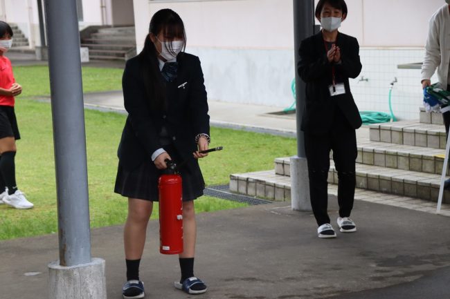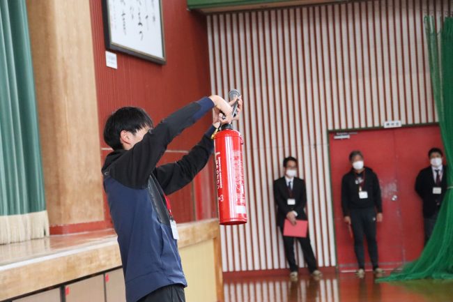 避難後は初期消火の指導を通して、消火器の使い方について説明がありました。