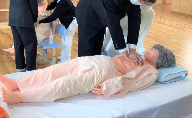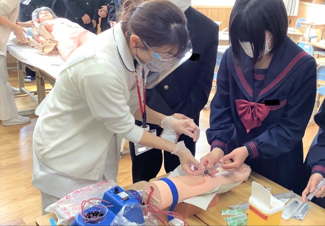 また、看護体験では無菌操作体験・採血体験・モデル人形(八重さん)を使ってのAED体験など多くの体験を行いました。体験を通して日常生活で意識や呼吸のない方を発見したら早く119番通報を行い心肺蘇生法やAEDを用いて電気ショックを行うことで大切な命を救うことにつながることを改めて認識していました。
