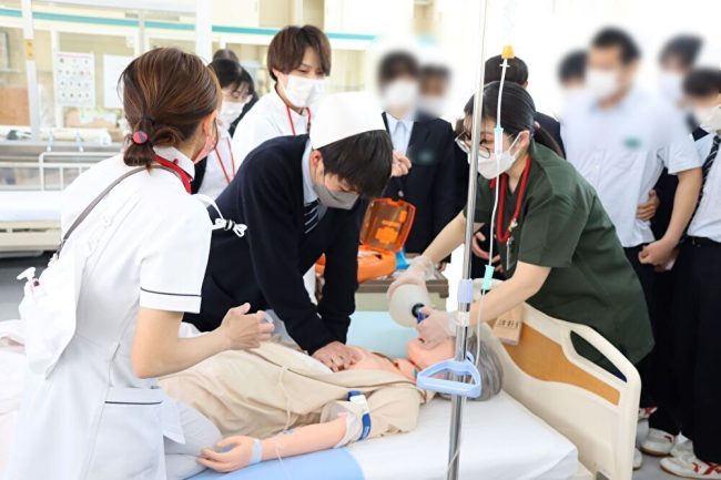 看護学科体験では、聴診器やAED、挿管器具など初めて触る医療器具に興味津々。