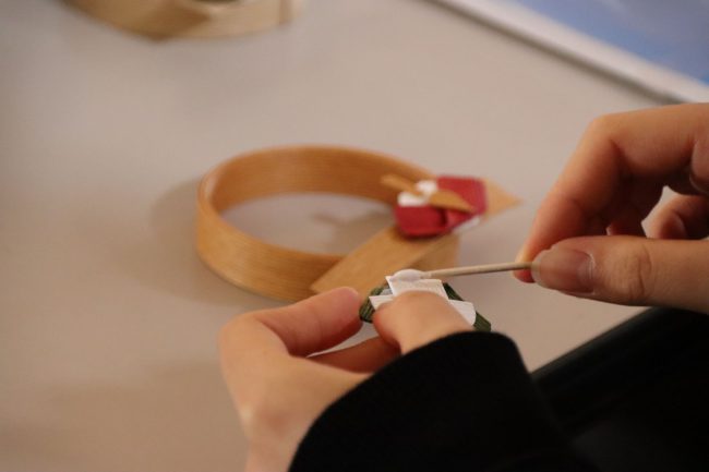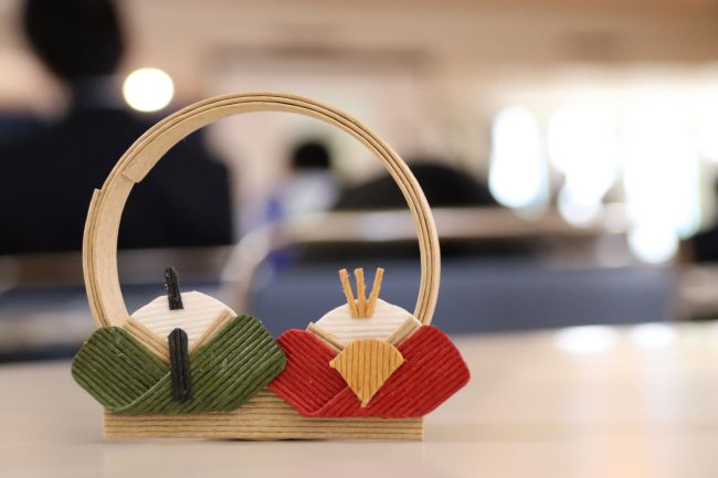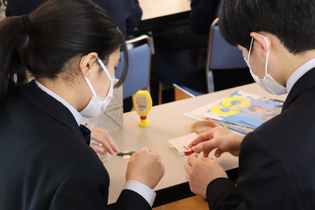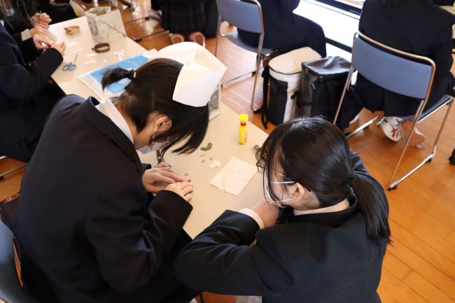 福祉体験では、今日がひなまつりであることから、お内裏様とお雛様をモチーフにした工作を行いました。