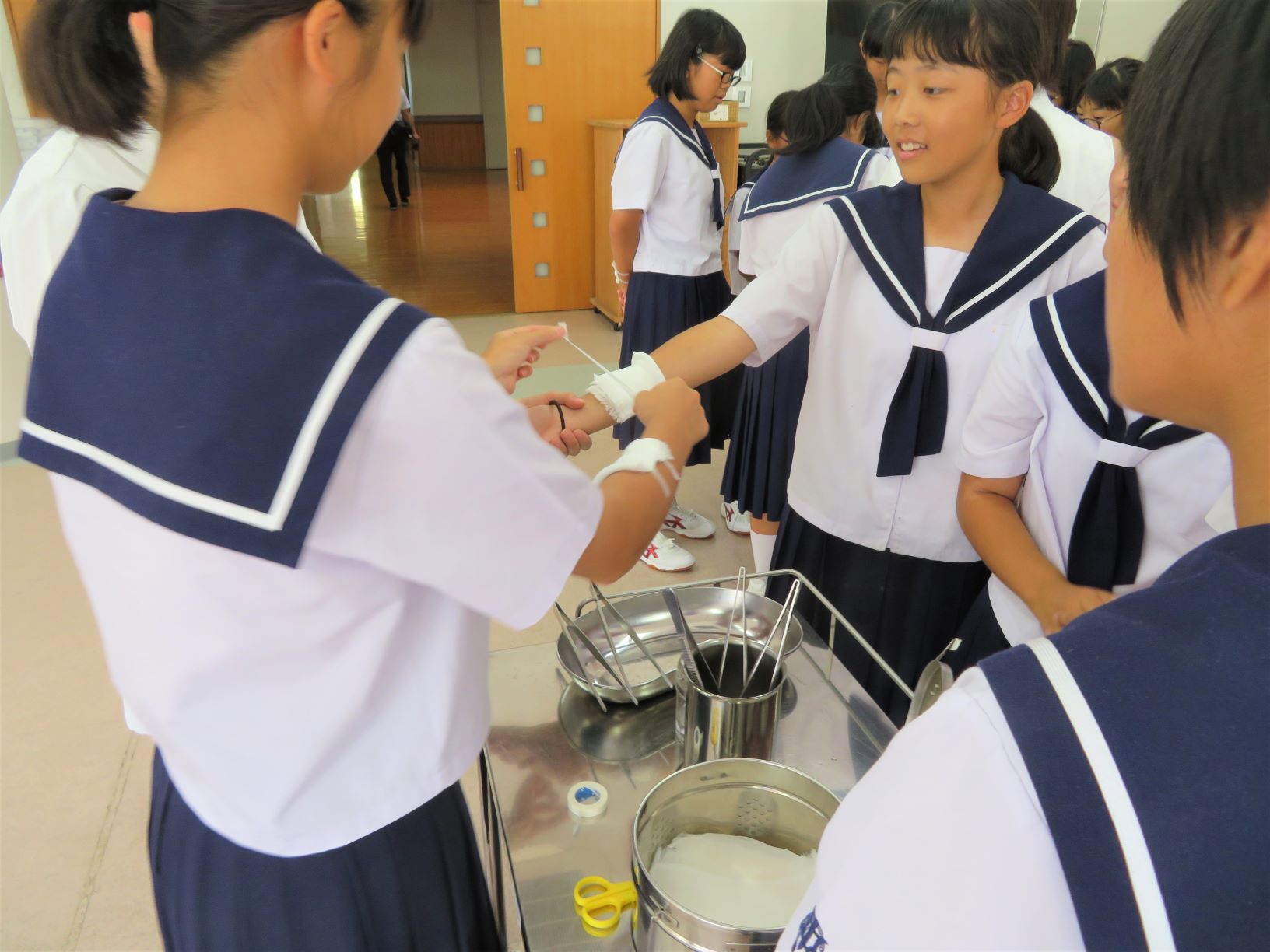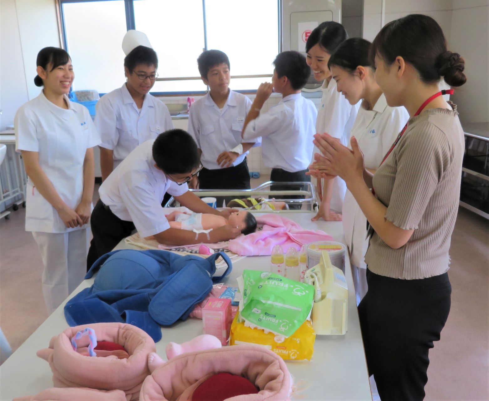 毎年恒例となっている指宿市立開聞中学校1年生の高校訪問。生徒33名、先生方3名が来校し、看護体験など1時間半ほどの体験学習となりました。ナースキャップをつけ、沐浴体験など笑顔いっぱいで取り組んでいました。