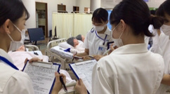 下の写真は、専門課程2年生「老年看護学 校内実習」での、肺炎患者のバイタルサイン測定の様子です。