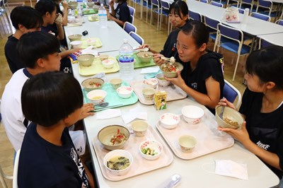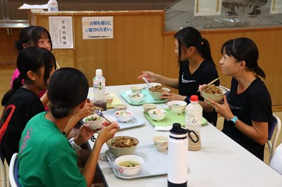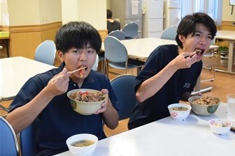 給食センターで調理された黒豚丼を寮生の皆さんはとてもおいしく食べながら、楽しい時間を過ごしました。