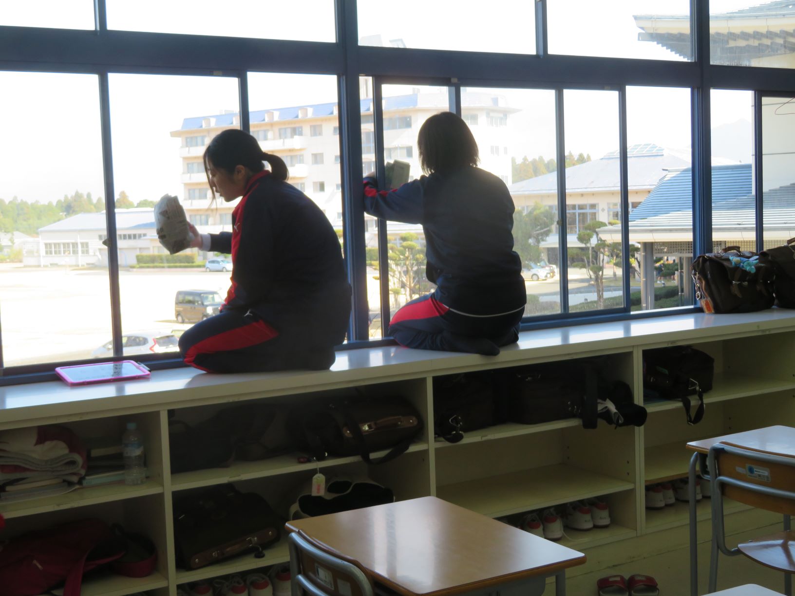 ▼愛校作業では窓ふきまで念入りに! ▼2学年は3月の修学旅行へ向けた集会実施