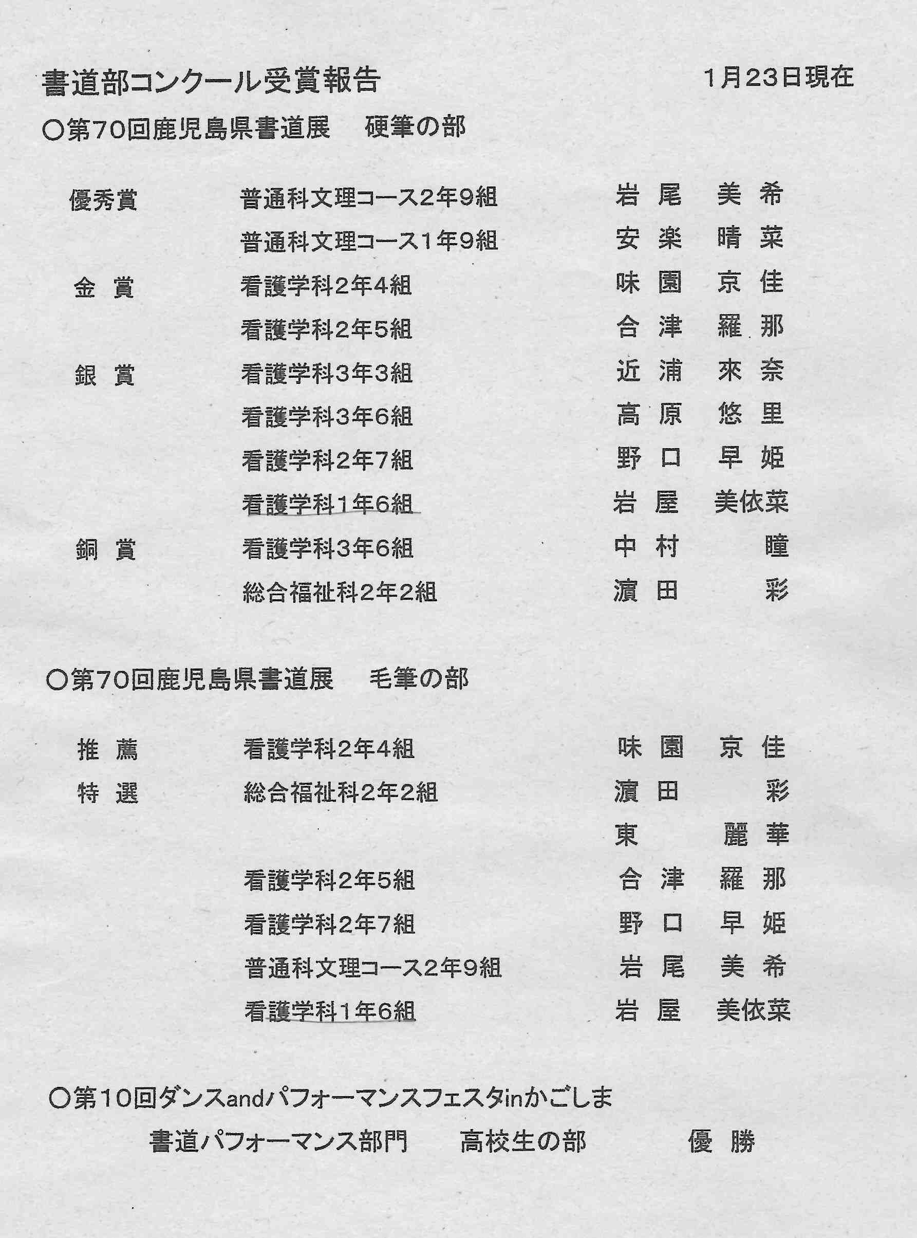 また「第70回鹿児島県書道展」(硬筆の部・毛筆の部)にも下記生徒が入賞しました。