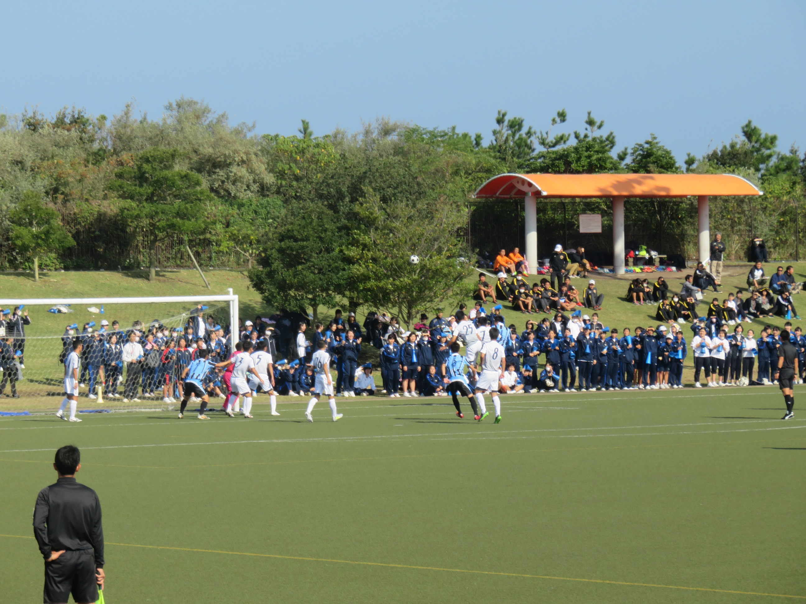 試合会場が、学校近くの桷志田サッカー場だったため、