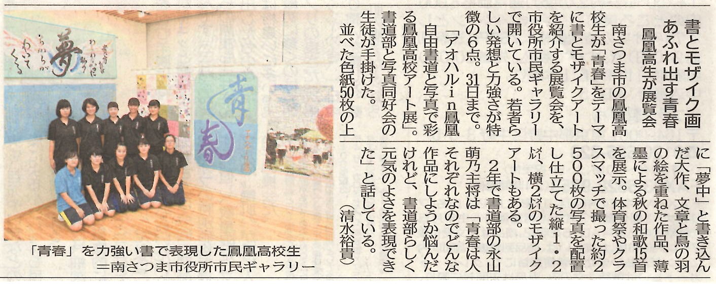 去る10/2から始まっている南さつま市市役所市民ギャラリーの『「アオハルin鳳凰」自由書道と写真で彩る鳳凰高校アート展』。本日の南日本新聞に掲載されました。今月31日まで絶賛展示中ですので足をお運びください。