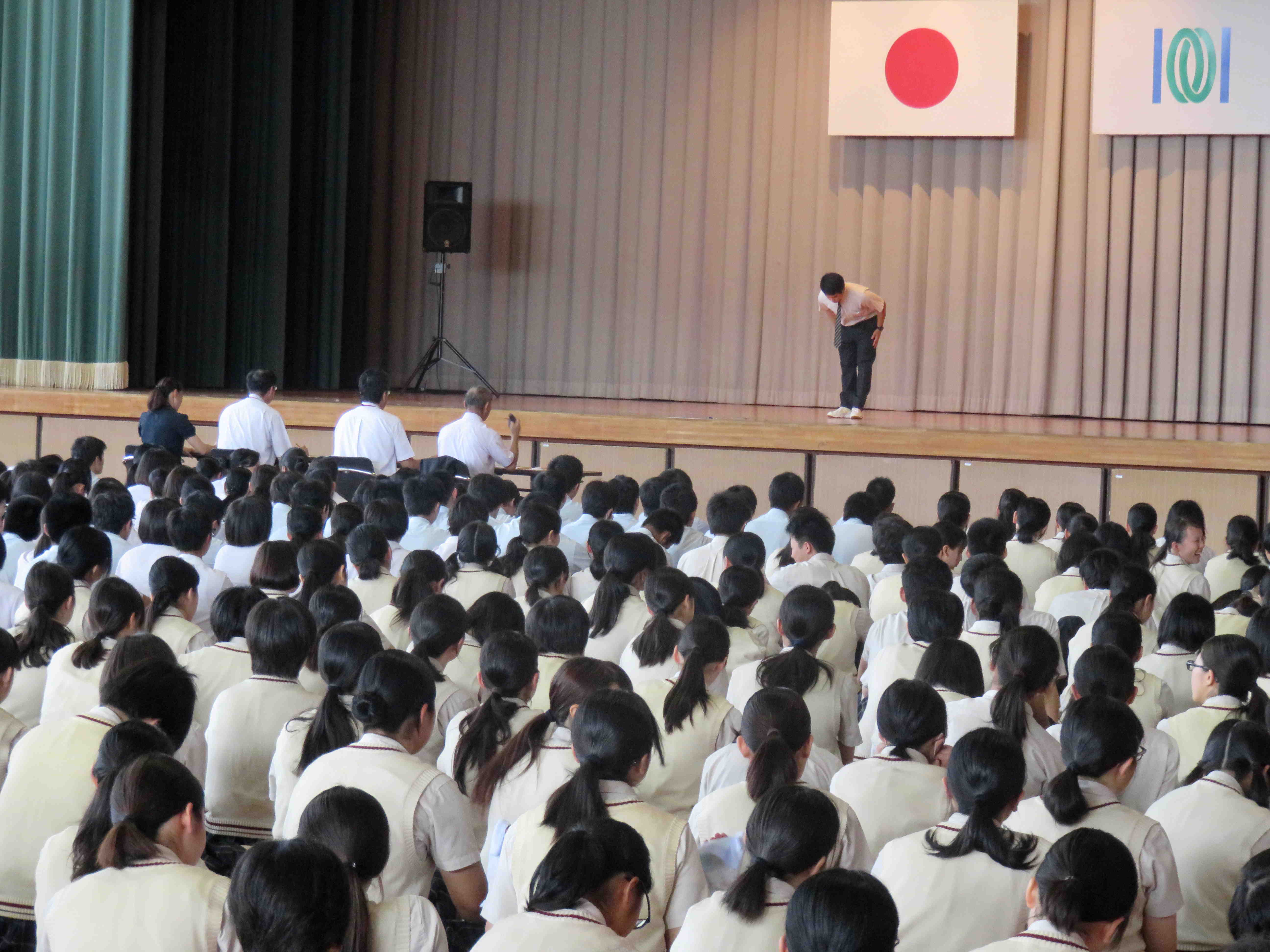 理事長・校長・本校職員からなる4名の審査員と、全校生徒を前に挨拶を行い、