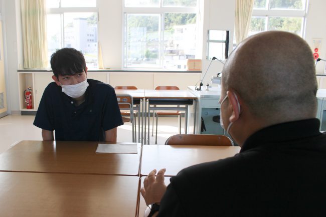 担任の先生の熱心な面接指導に真剣な眼差しの生徒。