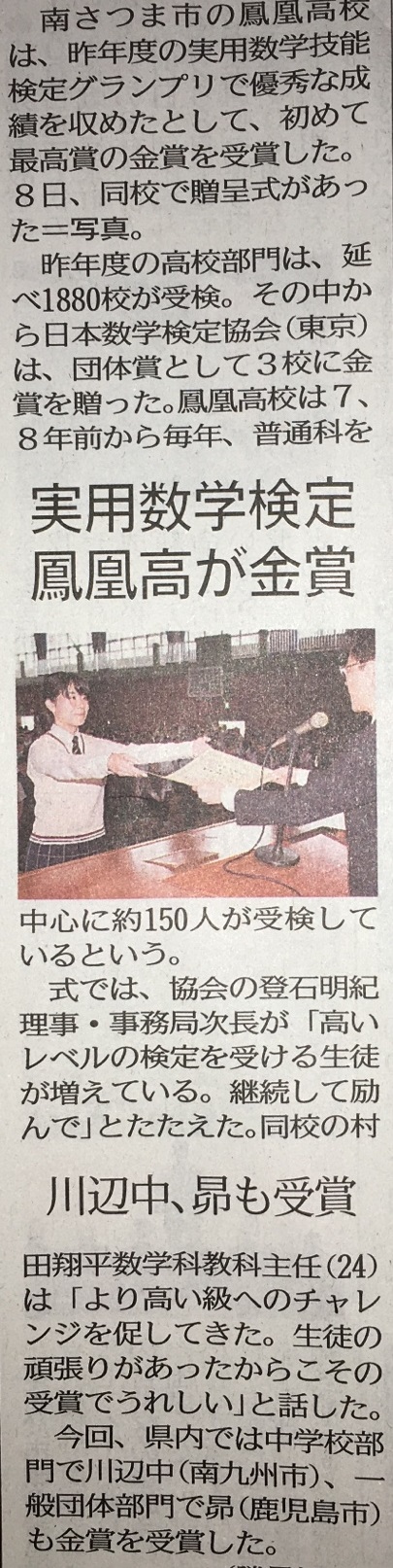 この賞は全国の数学検定受験校の中から合格率の高い学校を表彰するもので、高等学校部門では3校が受賞しました。