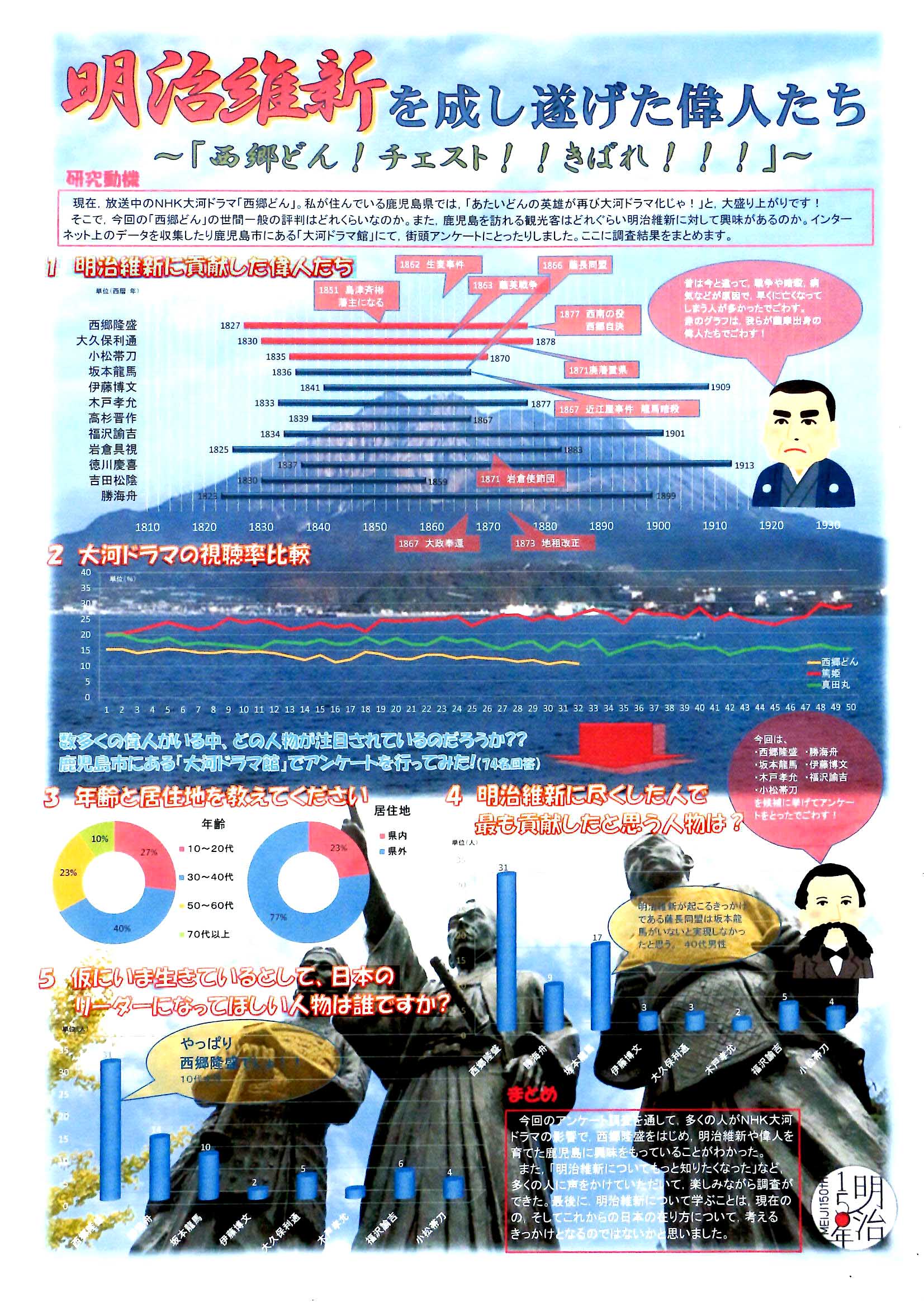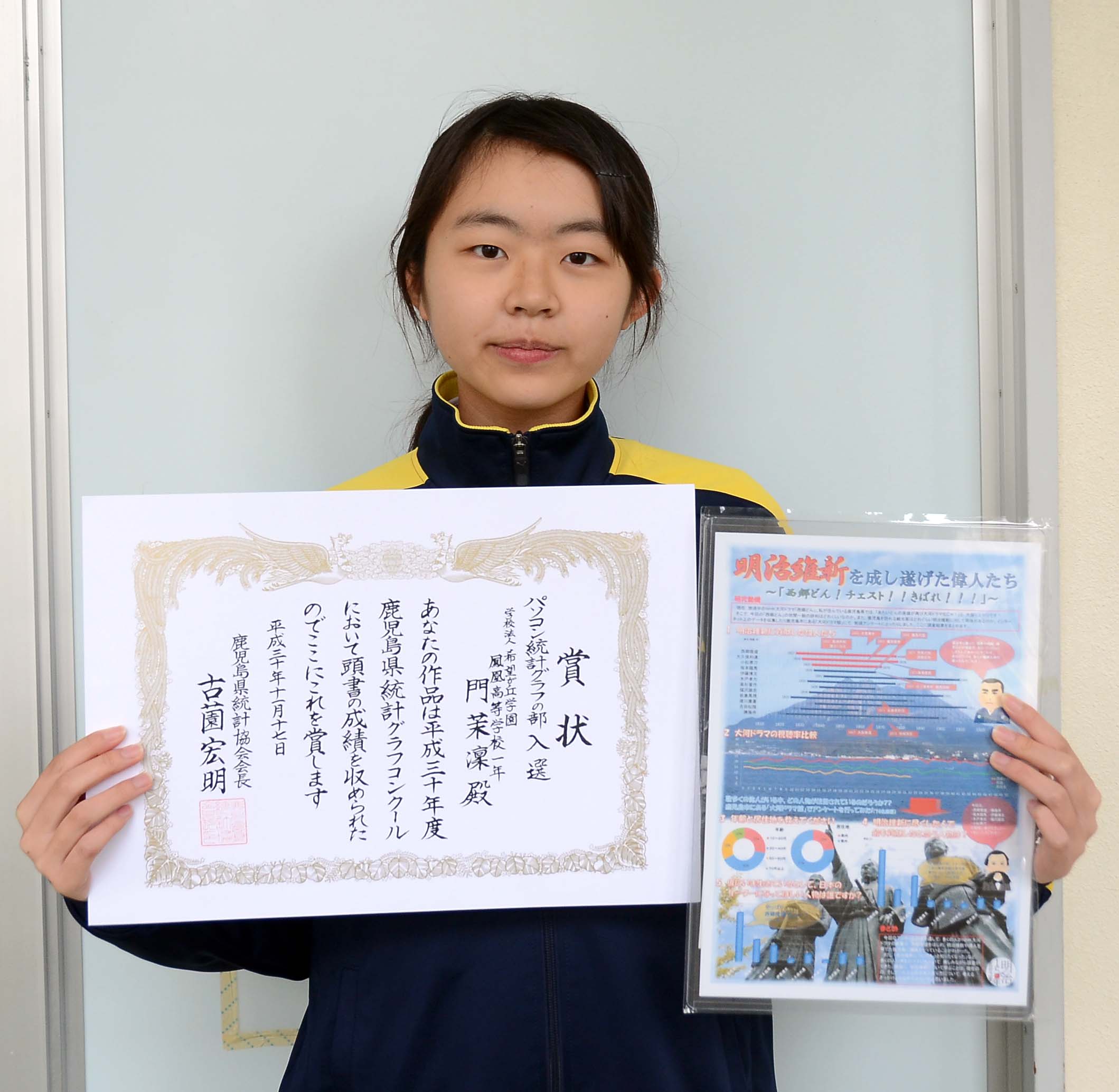 門さんは「中学校時代の教頭先生の勧めで始め、2年連続全国3位に入っていたので、今年の県3位入賞は少し悔しい」と残念そう。しかし、作品は視聴率やアンケートを棒グラフや円グラフにまとめ、西郷さんや桜島を背景にしており郷土色たっぷりの出来。とても立派な作品に仕上がっています。