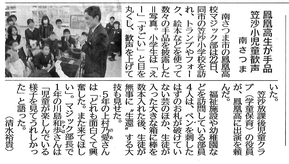 1/24(木) マジック部が小学生に手品披露 2019年1月24日 最終更新日時 : 2019年4月3日 hooh 本校マジック部の4人が、1月22日(火)南さつま市笠沙小学校を訪れて、子供たちに様々な手品を披露した様子が本日の南日本新聞に掲載されました。マジック部はかねてから老人施設や福祉施設、地元の敬老会などで出張手品を披露しております。荒巻教諭が先導となって多くの団体と交流を重ね、今ではいろんなところからお呼びがかかるようになりました。生徒たちも「見て下さる方の顔がぱっと明るくなり、喜んで下さることが何よりうれしい」と語ります。これからも地道な活動を続けてくれるものと思います。