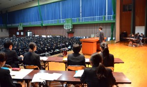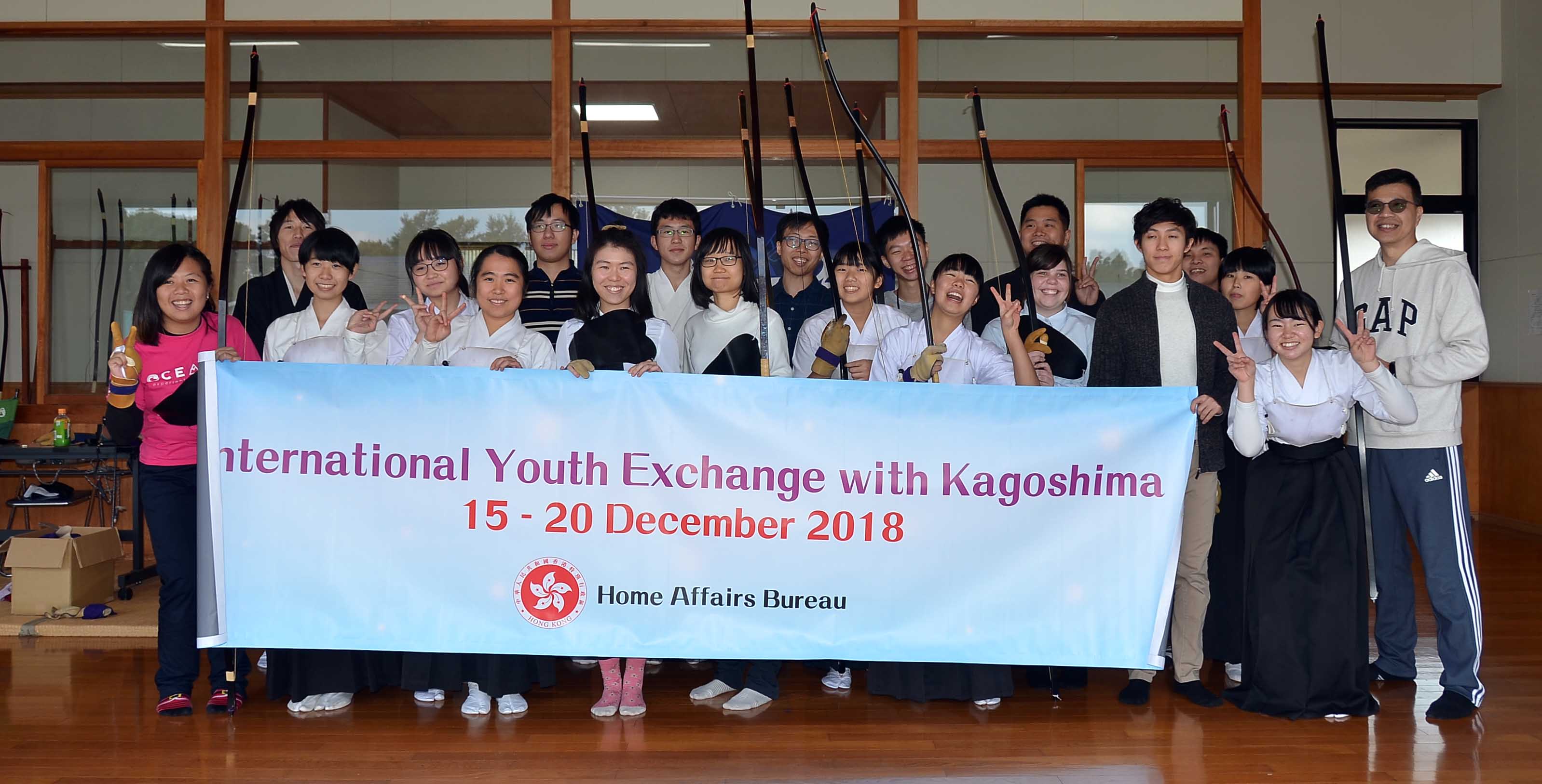 鹿児島県の「青少年海外ふれあい事業」で香港から10名の若者が来校しました。20歳代の男性7名と女性3名です。5泊6日の日程で鹿児島の文化や日常生活に触れながら交流を深めていく予定で、本日は本校で「弓道」を体験し、また、普通科1年生と英語での交流会を開きました。