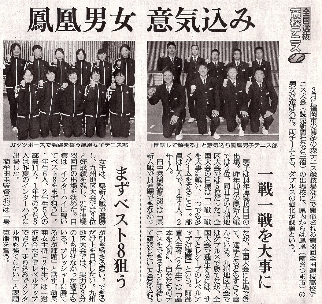 2/3 男女硬式テニス部 全国選抜大会出場決定 2016年2月3日 最終更新日時 : 2019年4月4日 hooh .男女硬式テニス部が、全国選抜大会へ出場することが決定し、新聞に紹介されました。 一般入試合格者の集い が実施されます。 2/3(水) 18:30 ~ 普通科(南さつま市以外の方) 19:00 ~ メディカルシステム科 2/4(木) 18:30 ~ 普通科(南さつま市の方) 19:00 ~ 総合福祉科 学科やお住まいの地域によって日程が異なりますので確認をお願いいたします。 今月・3学期の行事予定 ↓↓↓↓↓↓↓↓ クリック・タップしてください。 2月行事予定 3学期行事予定