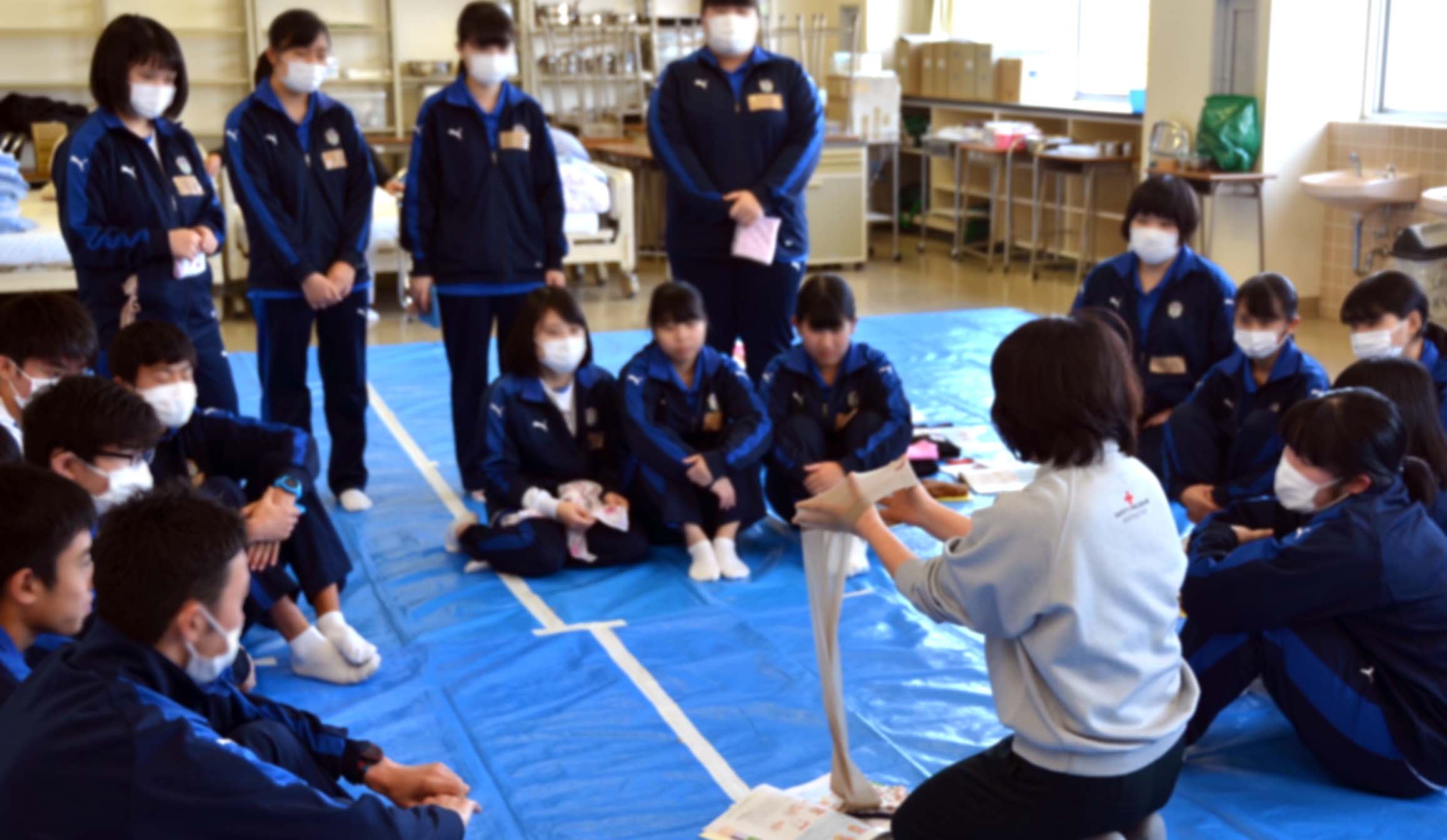 福祉科の生徒たちは高齢者施設に就職する生徒が多いのですが、施設を訪問する乳幼児への対応だけでなく、将来、家庭を持った時に役立つほか、何よりもきちんとした知識をもつことで、身近な突発的出来事に対処できる可能性が増えます。写真はストッキングを使った包帯法の実技講習の様子です。