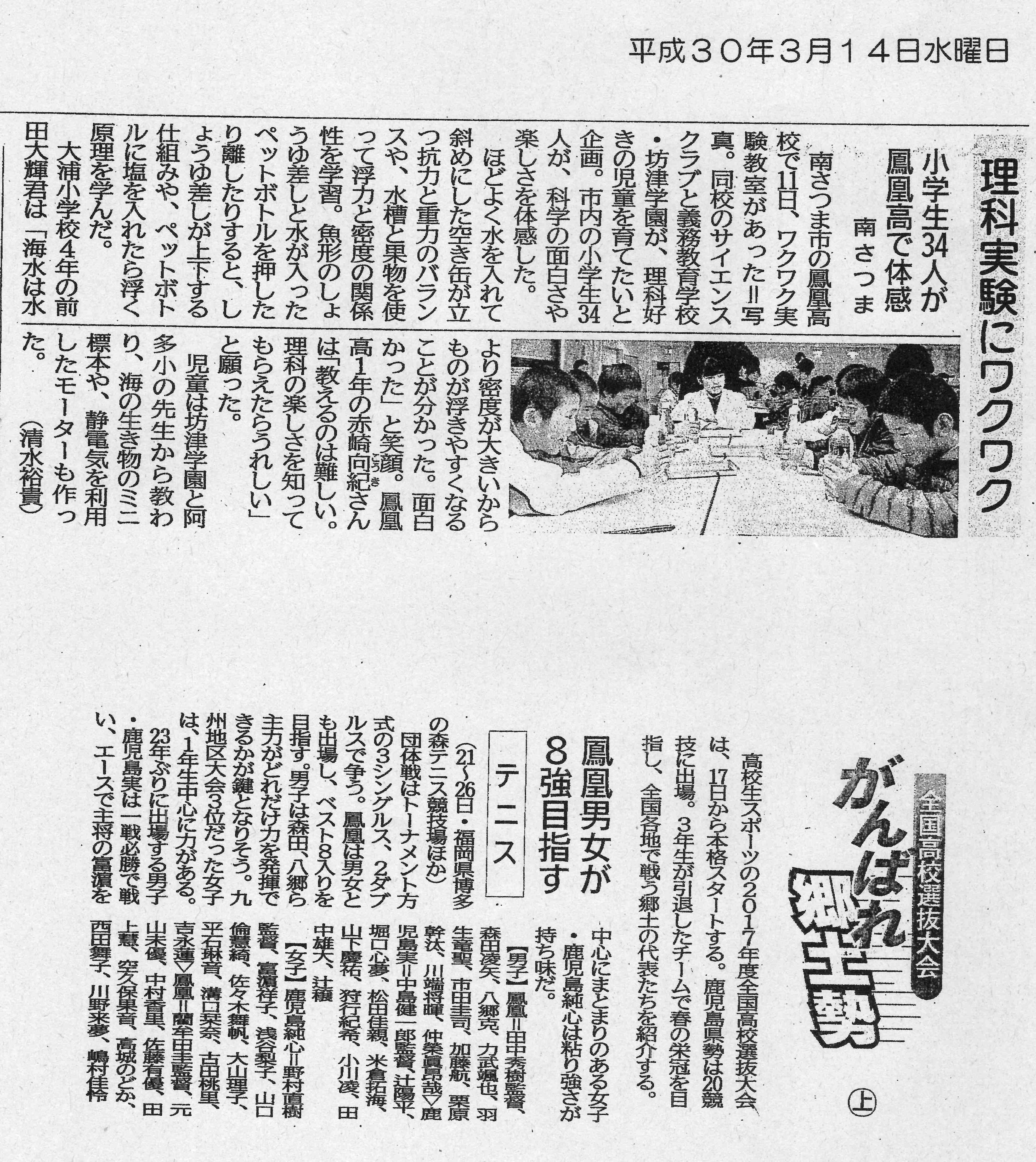 3/14(水) 「南日本新聞」ワクワク実験教室&男女テニス部記事