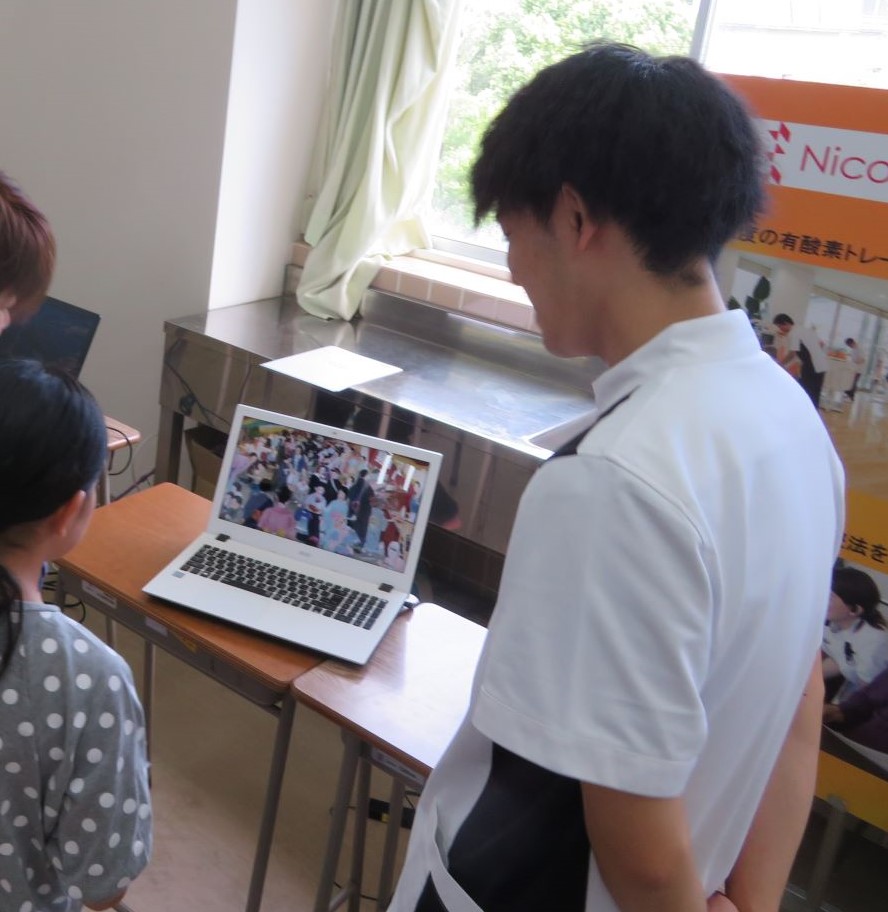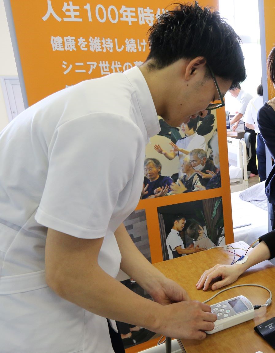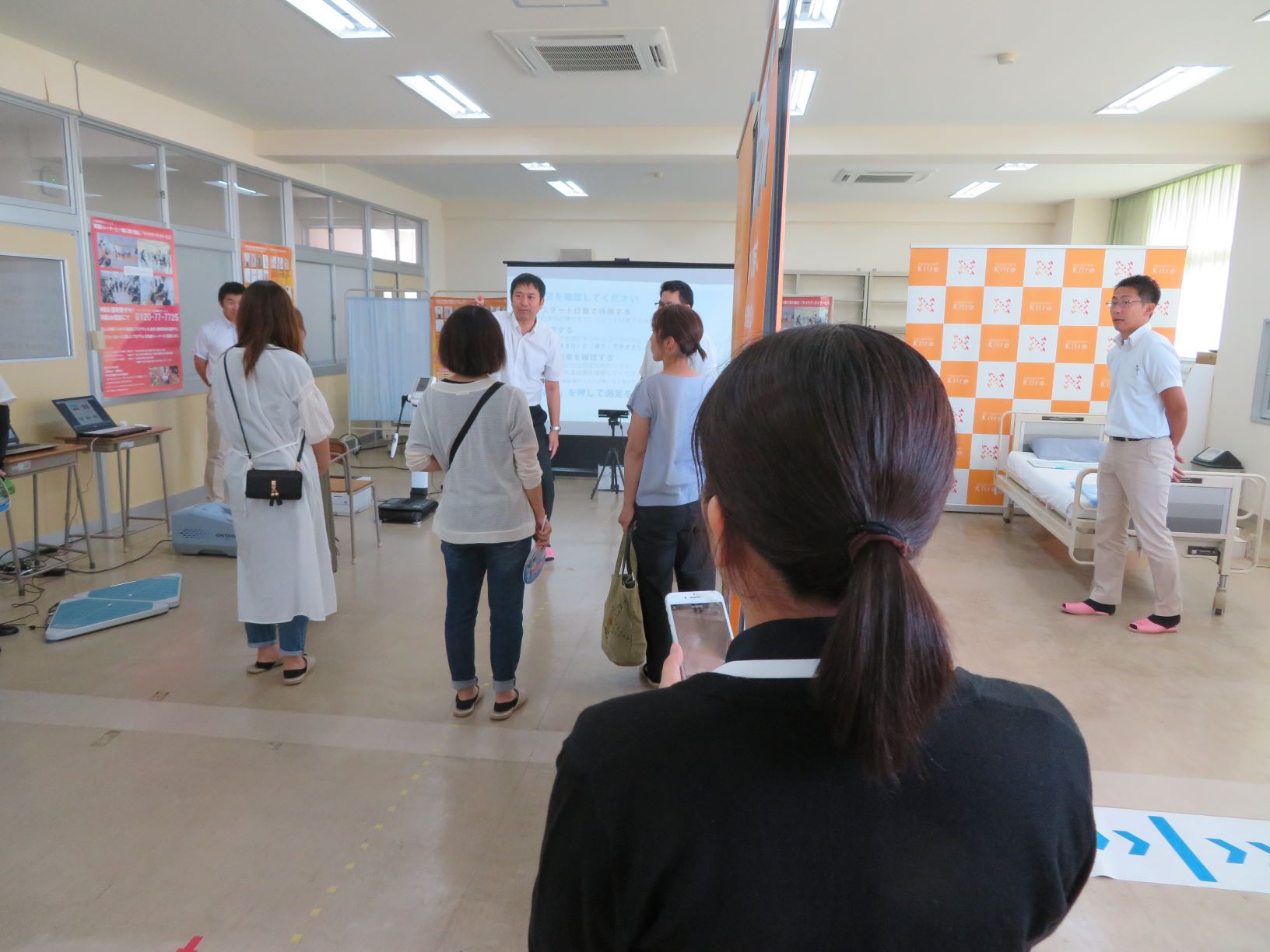 ▼8月の本校体験入学でも、総合福祉科学科体験ブースに来られた保護者の方々に現場の最新機器を説明してくれました。