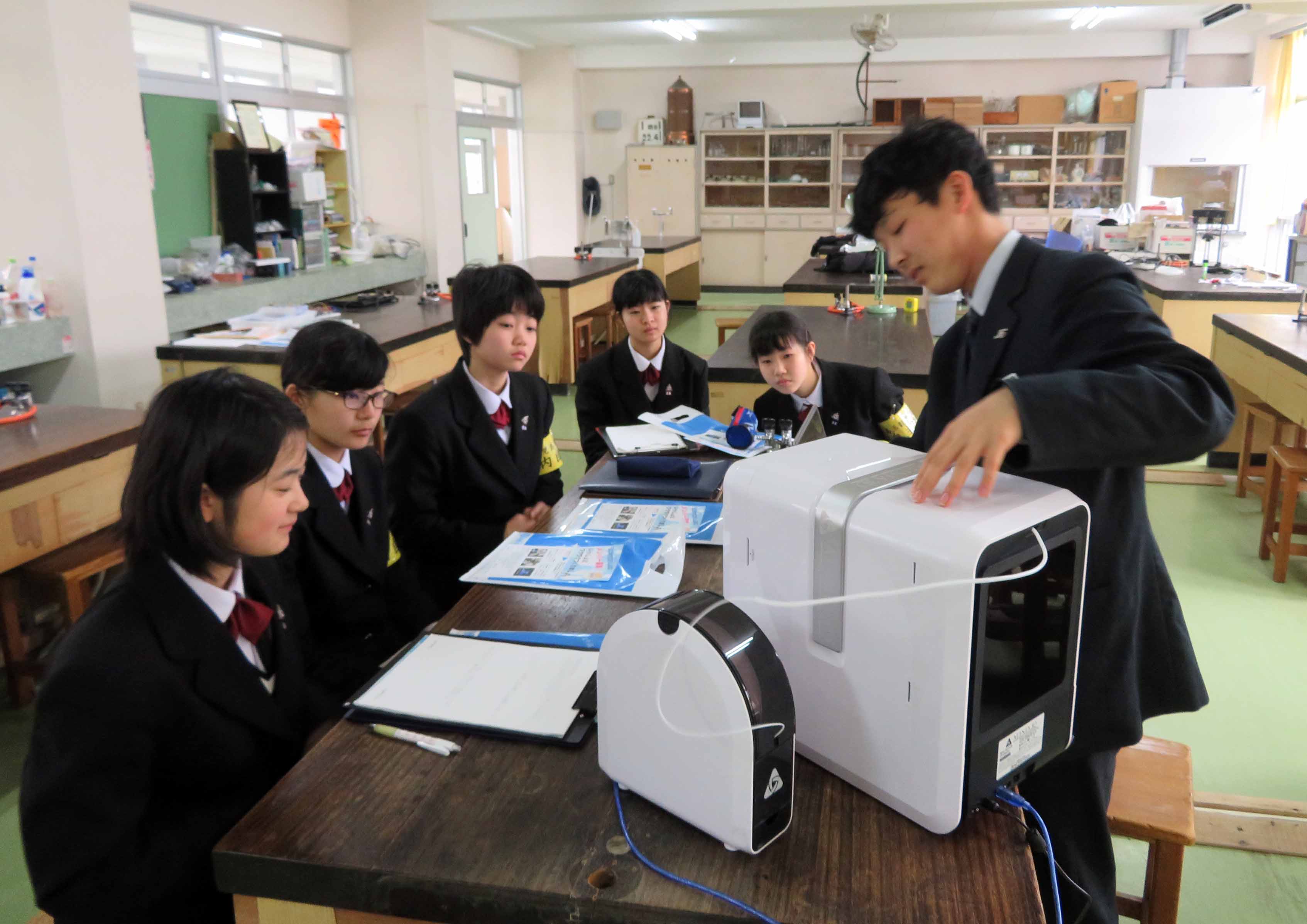 鹿児島玉龍中の1年生の皆さん5人が自主研修で来校されました。総合的な学習の一環「かごしま学」の中で、興味を持った県内の行事や出来事を自ら企画立案し行動・学習するというものでした。5人の皆さんは鹿児島市内からバスの時刻や料金を調べ、引率なしで雨の中を来校されました。リビング新聞で、本校3年生加藤陸君が3Dプリンターで「バランチボックス」を作成したという記事を読み興味を持ったそうです。