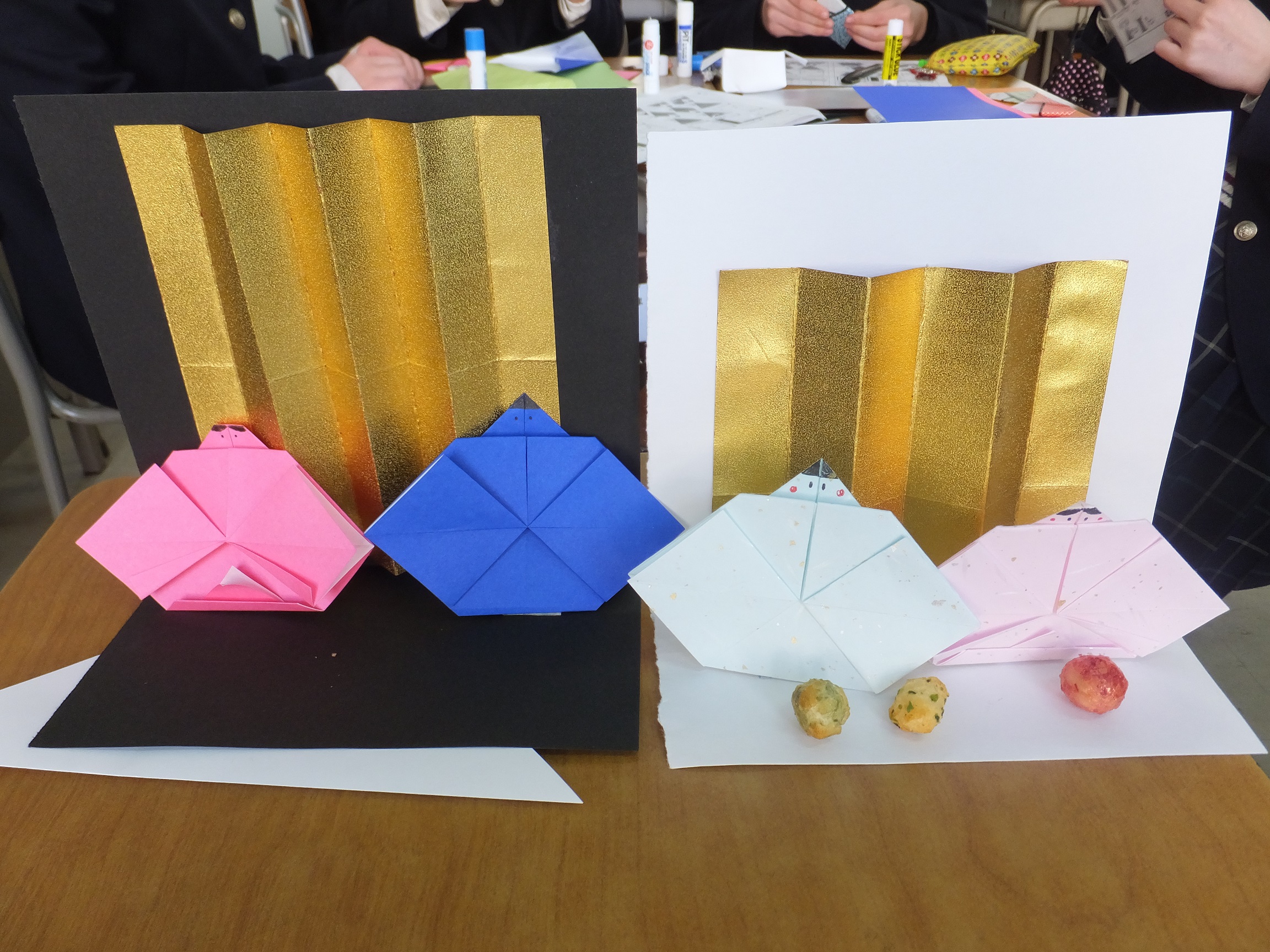 1・2年生を対象に、ひな祭りについての座学を行い、折り紙でおひな様を作り、桃の節句を祝いました。