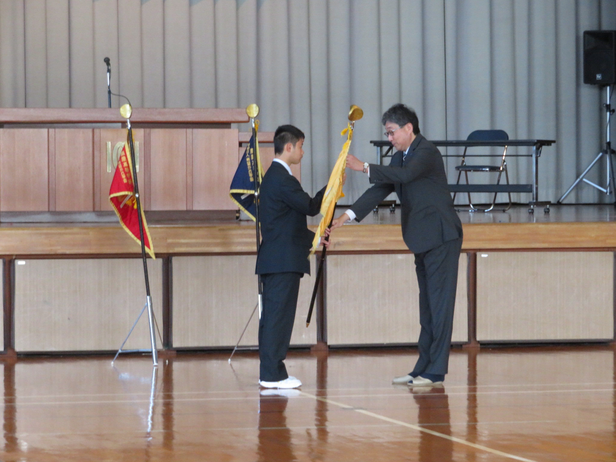 まず,校長先生から新1年メディカルシステム科の上野純也(大笠中出身)君へ黄色の学年旗が渡されました。