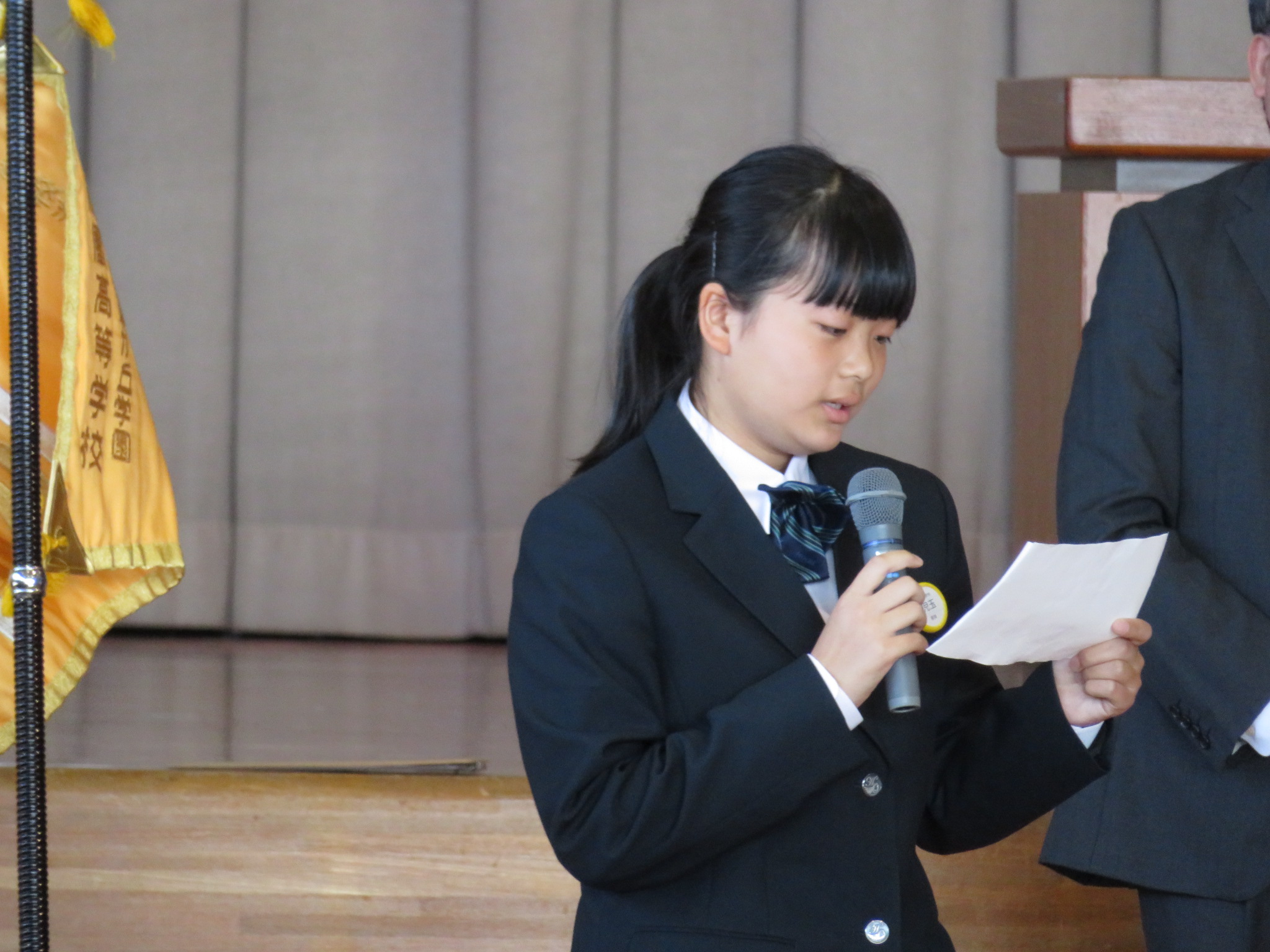 そして,新入生を代表して看護学科の児玉愛海(星峯中出身)さんが,「不安もあるが、一日も早く校風に馴染むように頑張る。」
