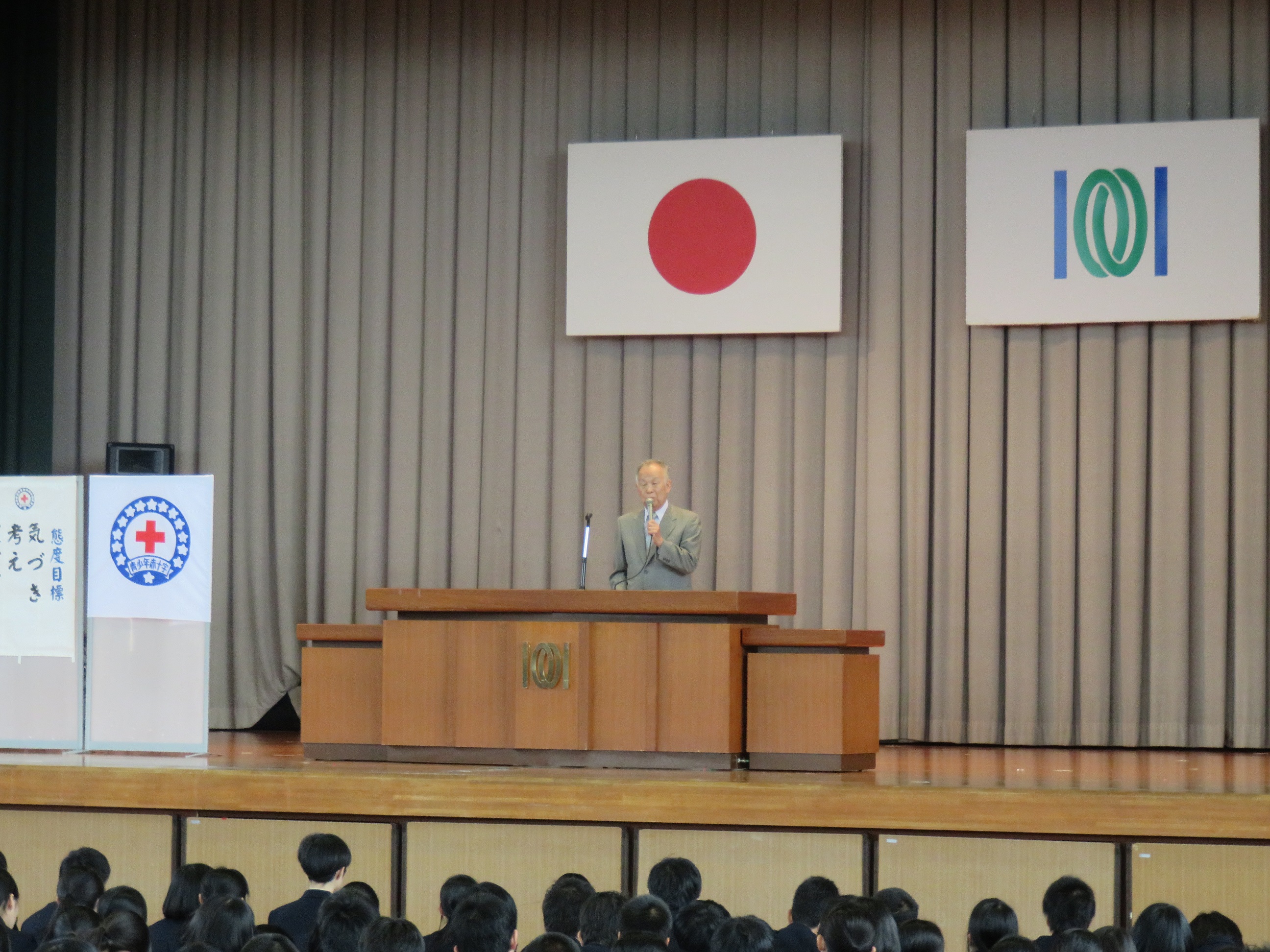 JRC登録式には日本赤十字社鹿児島支部より、中山忠順 先生 にお越しいただき、赤十字の理念や活動などについて講話をいただきました。