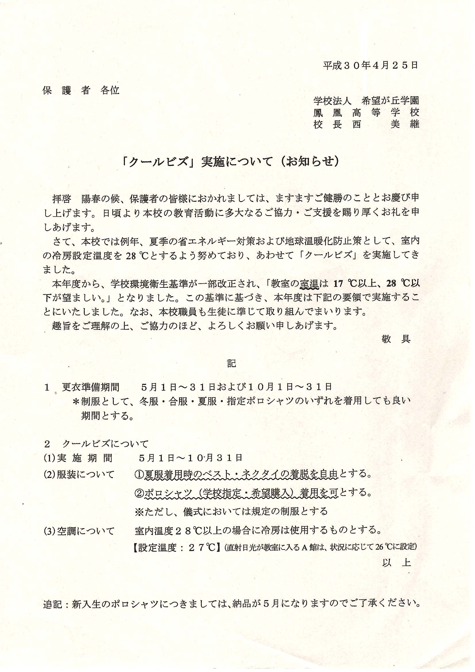 4/25(水) クールビズ実施について(お知らせ) 2018年4月25日 最終更新日時 : 2018年4月27日 hooh ■クールビズ実施について(お知らせ) ■本校イメージCM・昨年も九州3県で放映しました ■平成30年4月行事予定