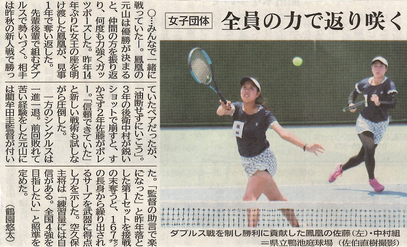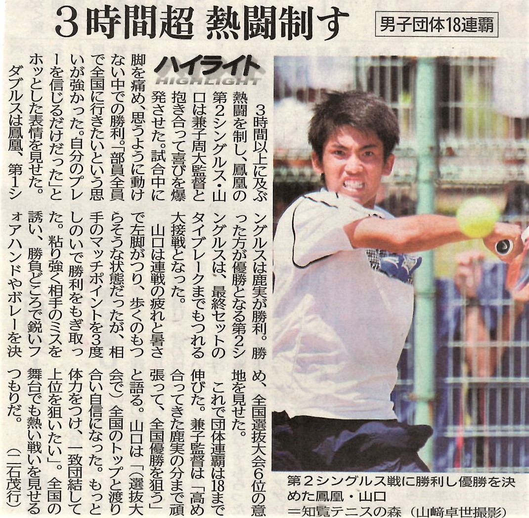 5/24(金) 男女テニス部新聞掲載=2019県高校総体 2019年5月24日 最終更新日時 : 2019年5月29日 hooh ★2019 県高校総体★ 昨日、県高校総体テニス競技で、見事に男女アベック優勝を果たした男女テニス部の記事が南日本新聞朝刊に掲載されました。学校でもクラス掲示し、喜びを分かち合いました。 明日は、女子サッカー、男女バスケットボール競技が予定されております。3年生の中には、この大会を最後に引退する生徒もいます。応援よろしくお願いします。 ▲2019年(令和元年)5月24日付南日本新聞
