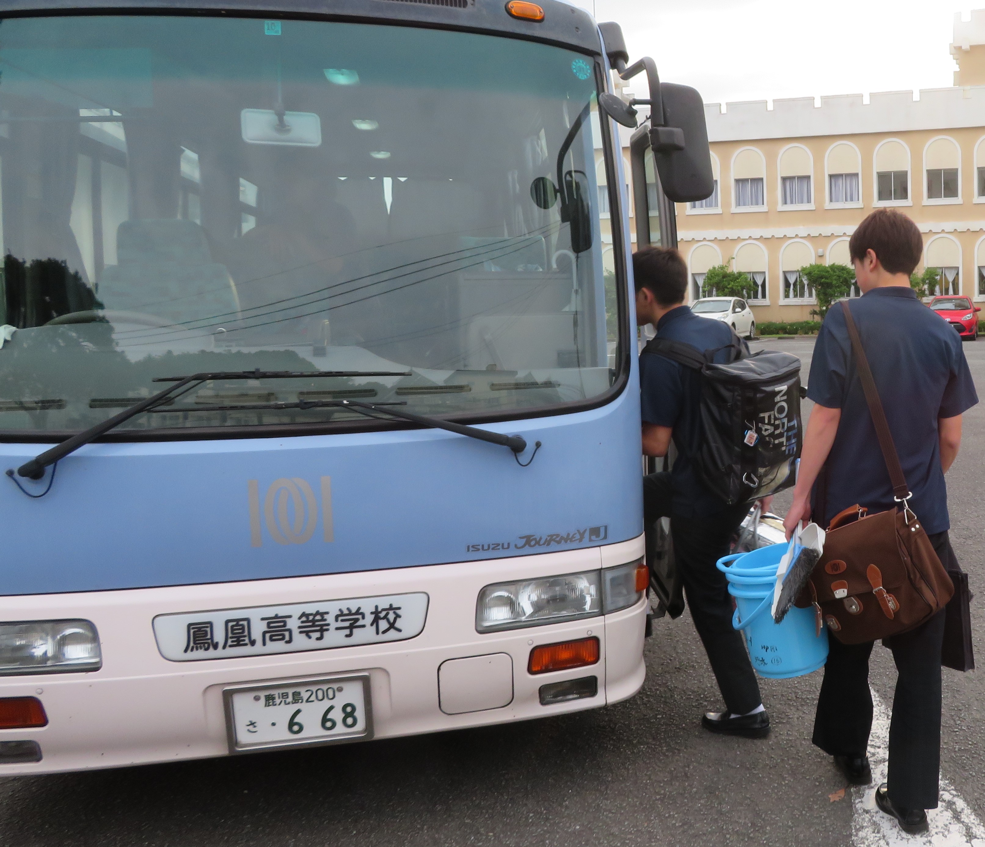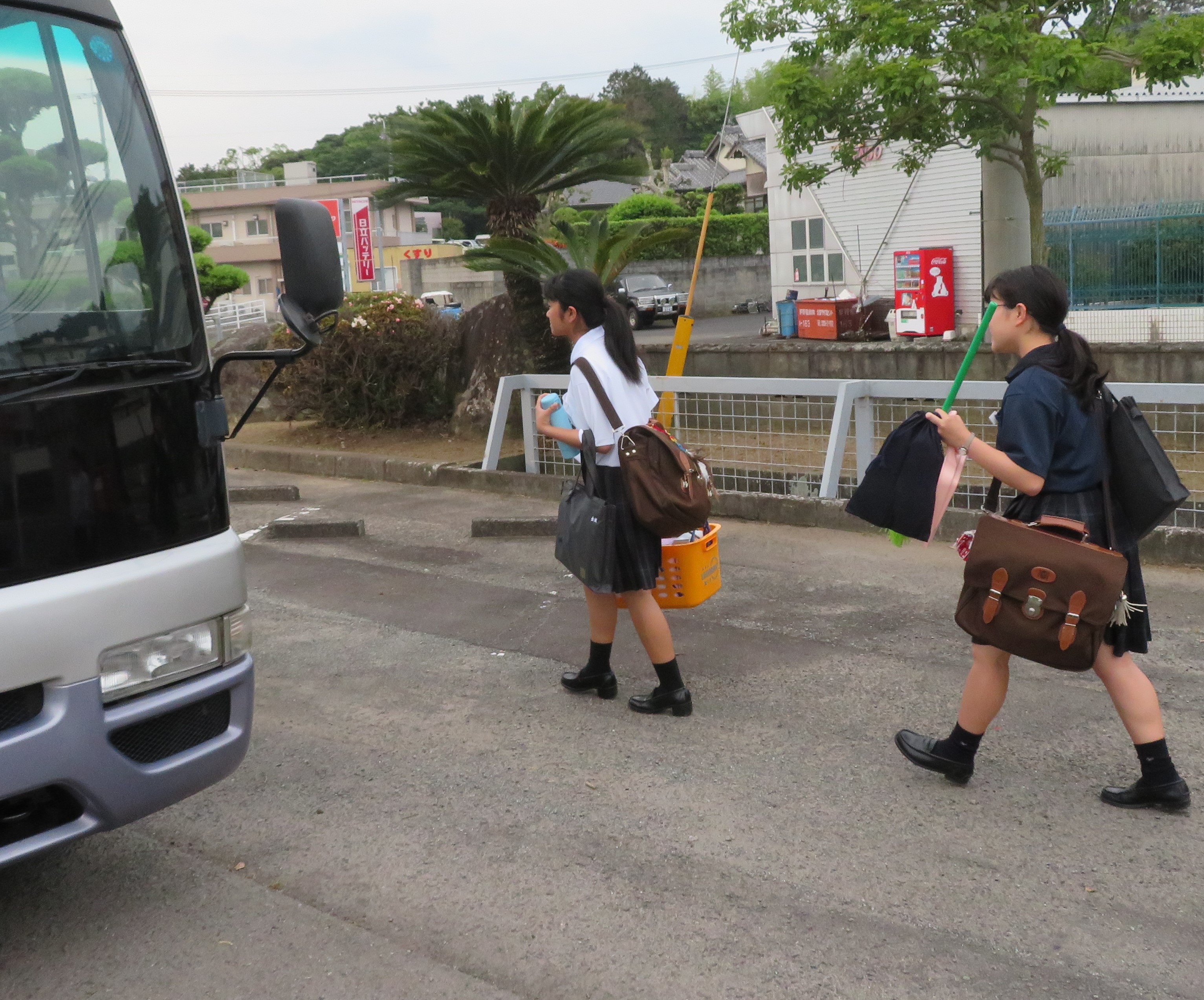 ▲手にいっぱいの実習備品を抱えバスへ乗り込みます。