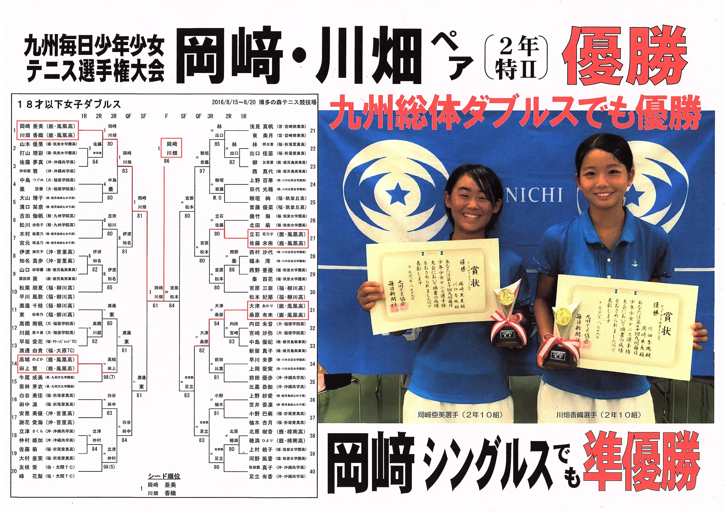 8/23 女子テニス部大会報告 2016年8月23日 最終更新日時 : 2019年4月3日 hooh 福岡で行われていた九州毎日少年少女テニス選手権大会においてまた快挙達成です。 18歳以下ダブルスの部で岡﨑・川畑(両名とも普通科特進Ⅱ類2年)ペアが優勝。 岡﨑は個人でも準優勝。 インターハイが残念な結果だっただけに嬉しいニュースとなりました。 ↓↓↓ クリック・タップしてください。 8月行事予定 9月行事予定 2学期行事予定