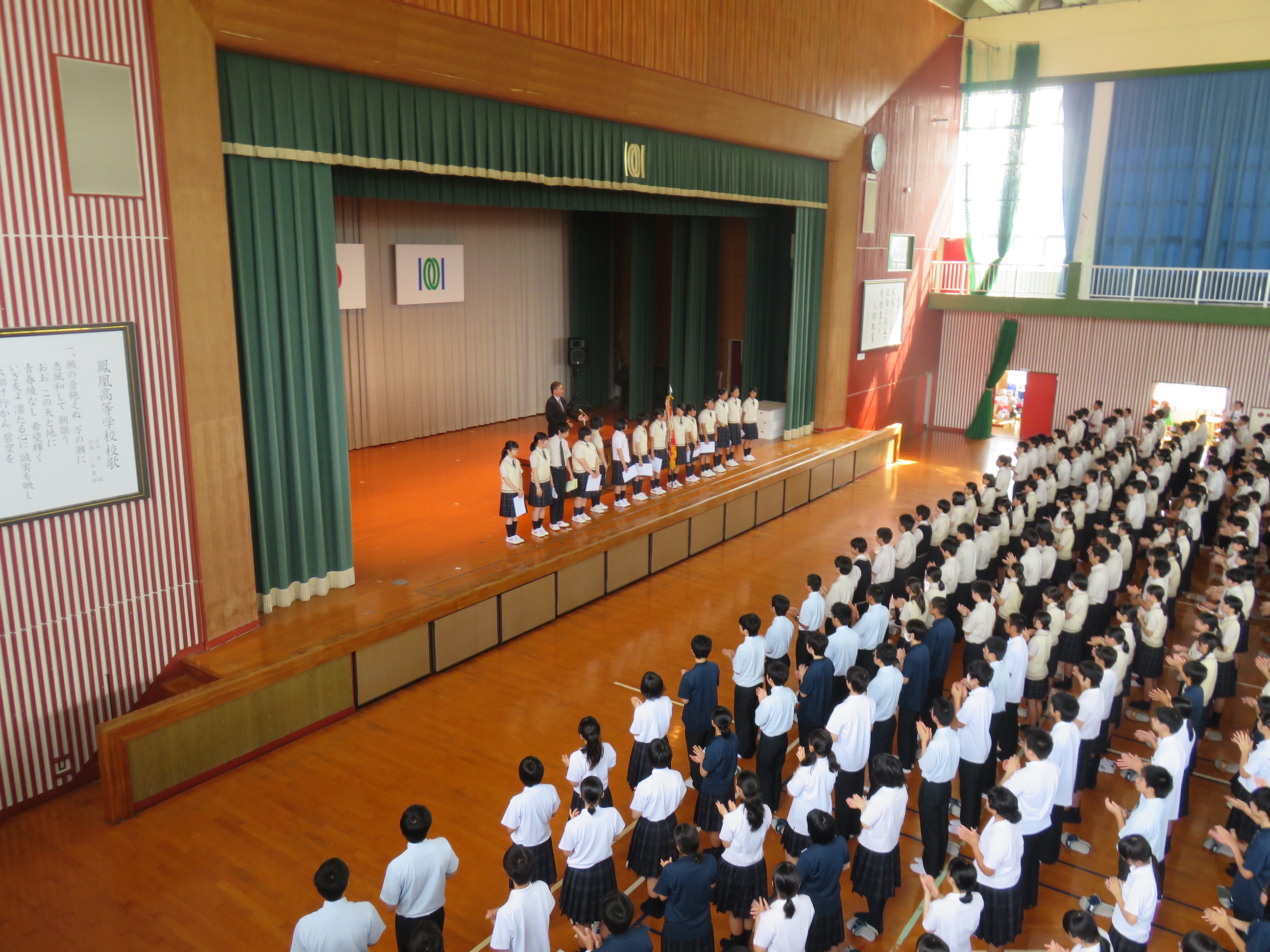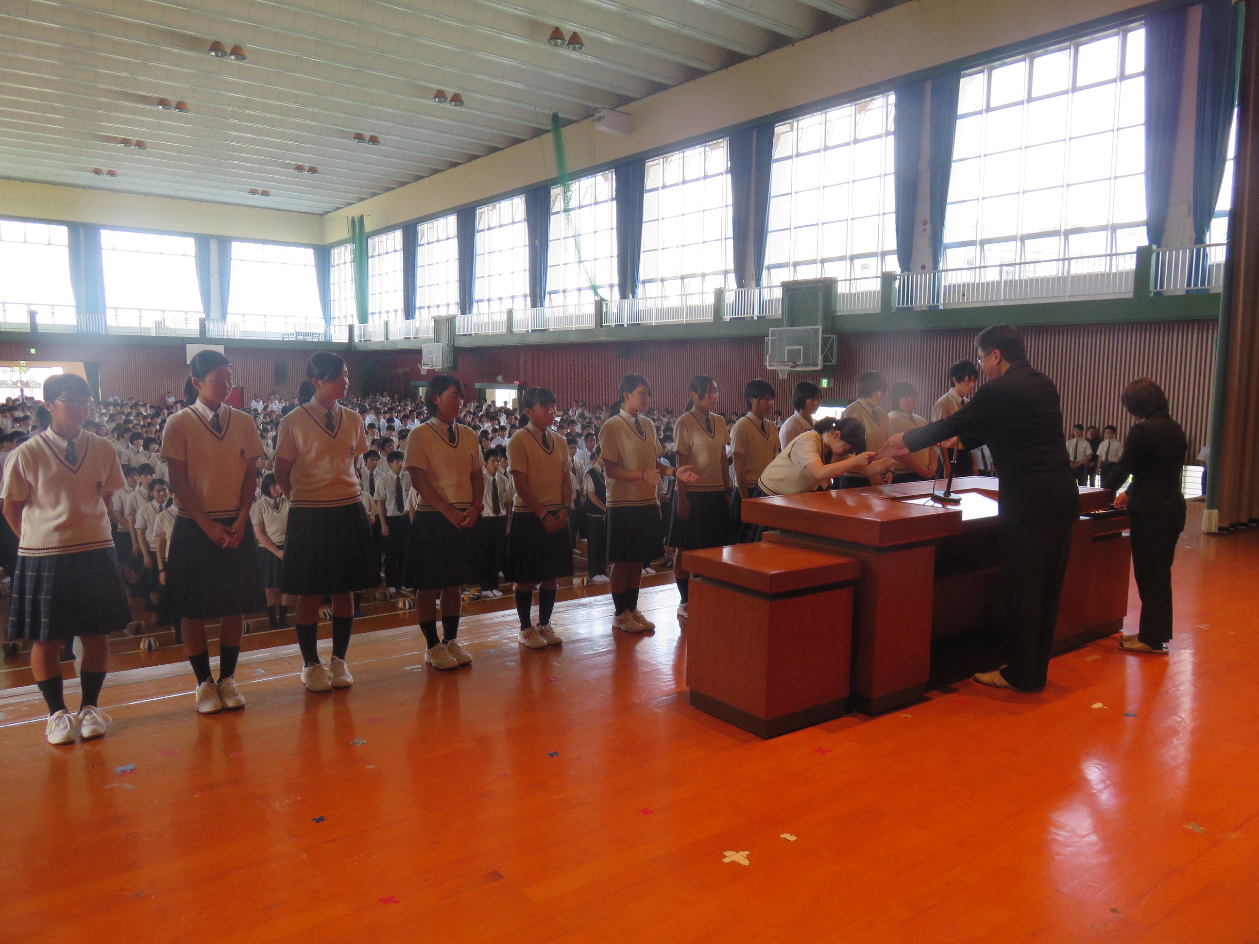 本日は登校日。全体朝礼が実施され、表彰式ではテニス・柔道・弓道の表彰が行われました。