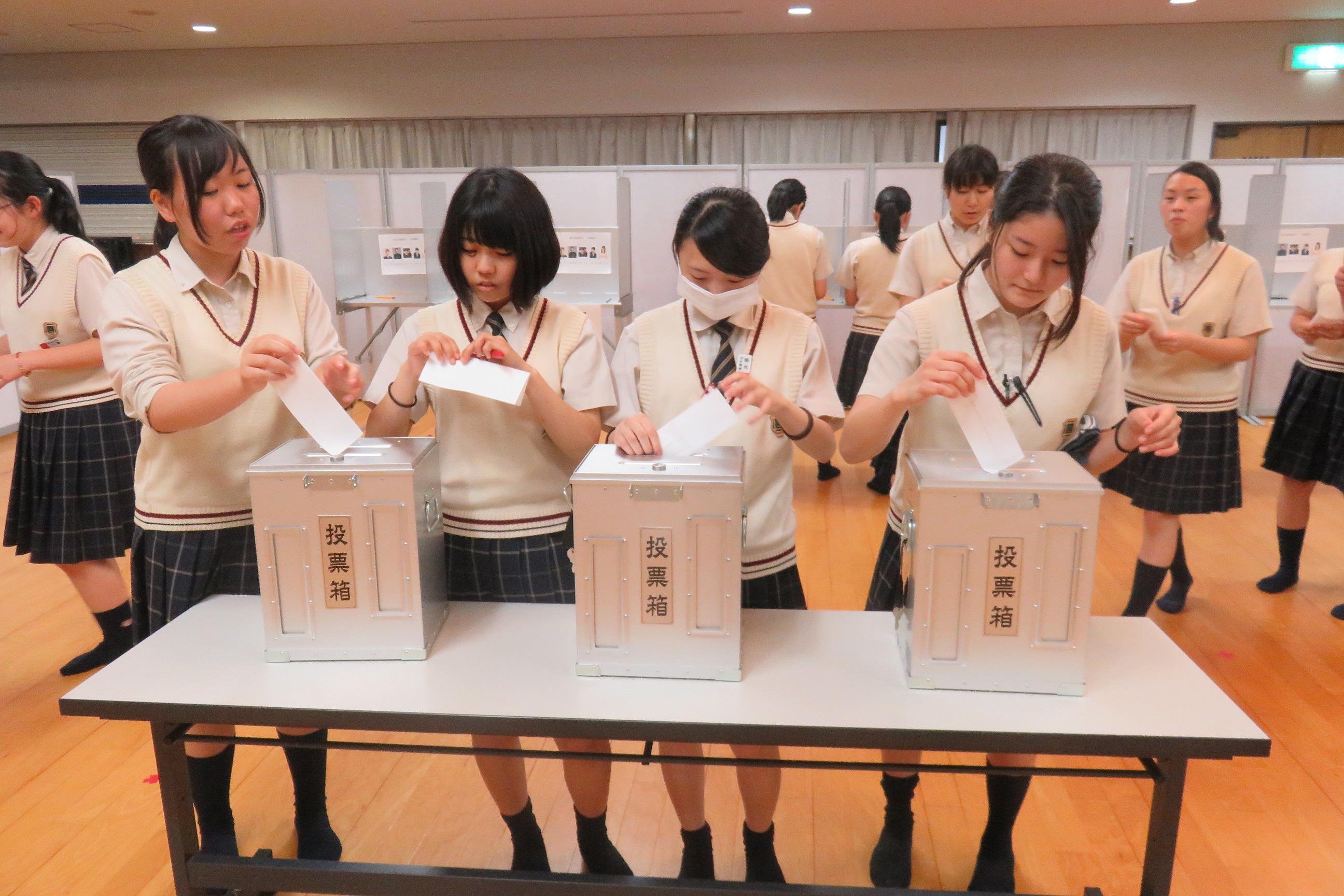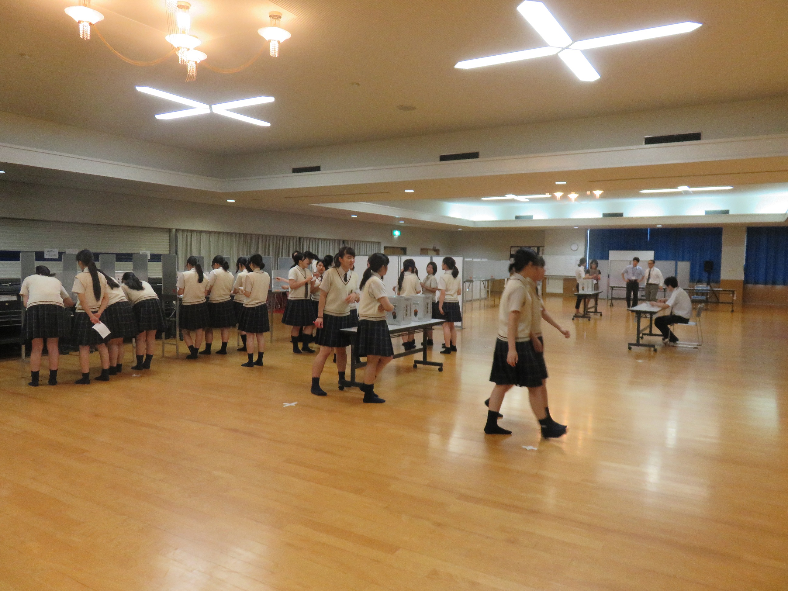実際に使用している投票箱を使用して投票所をつくり、候補者を記名して投票まで行いました。講師は本校社会科教諭の飯山先生でした。