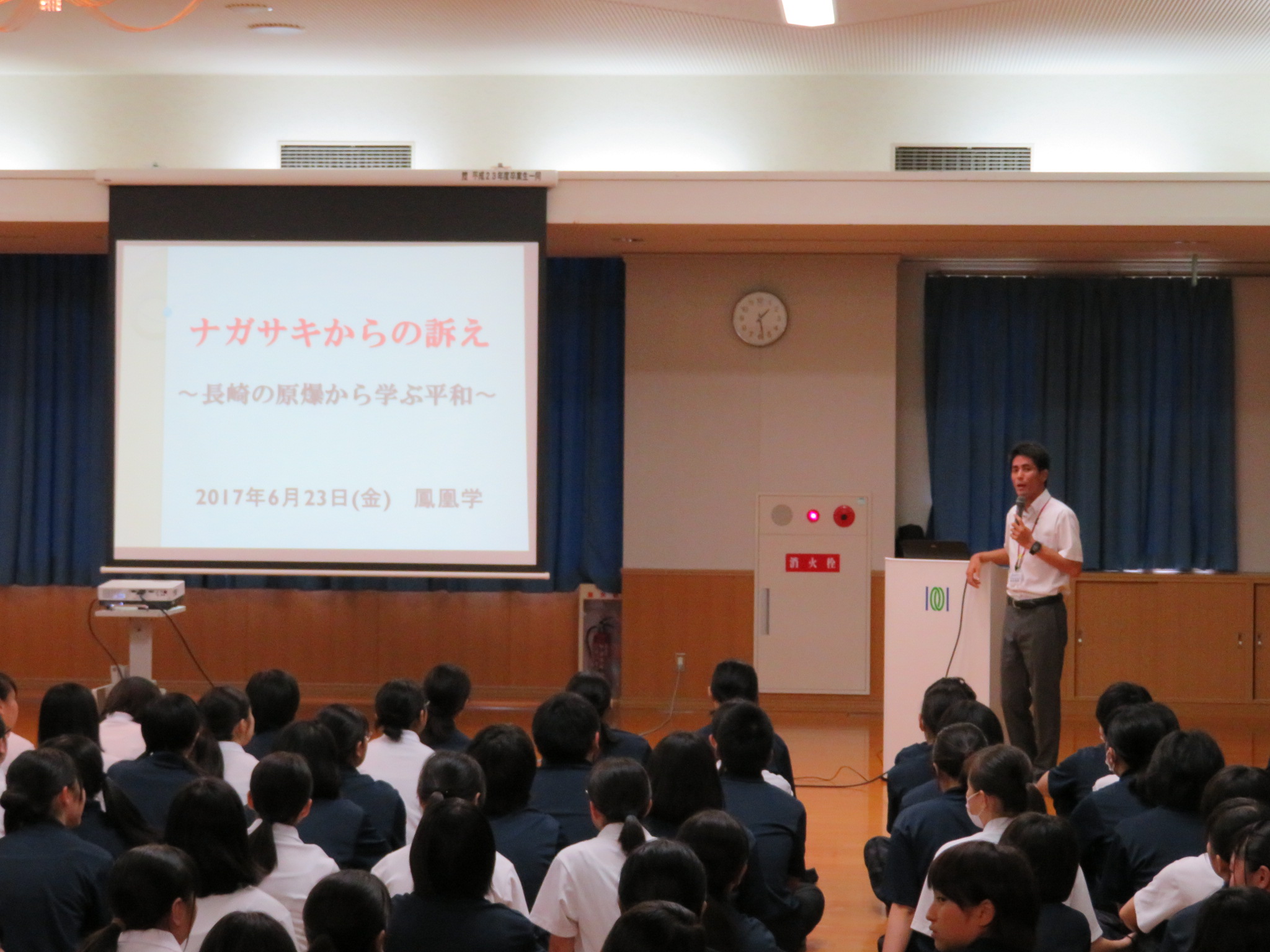 本日は1年生の「鳳凰学」において、本校教諭の松本亮祐先生に,長崎の原爆投下から,平和考える平和教育をおこないました。