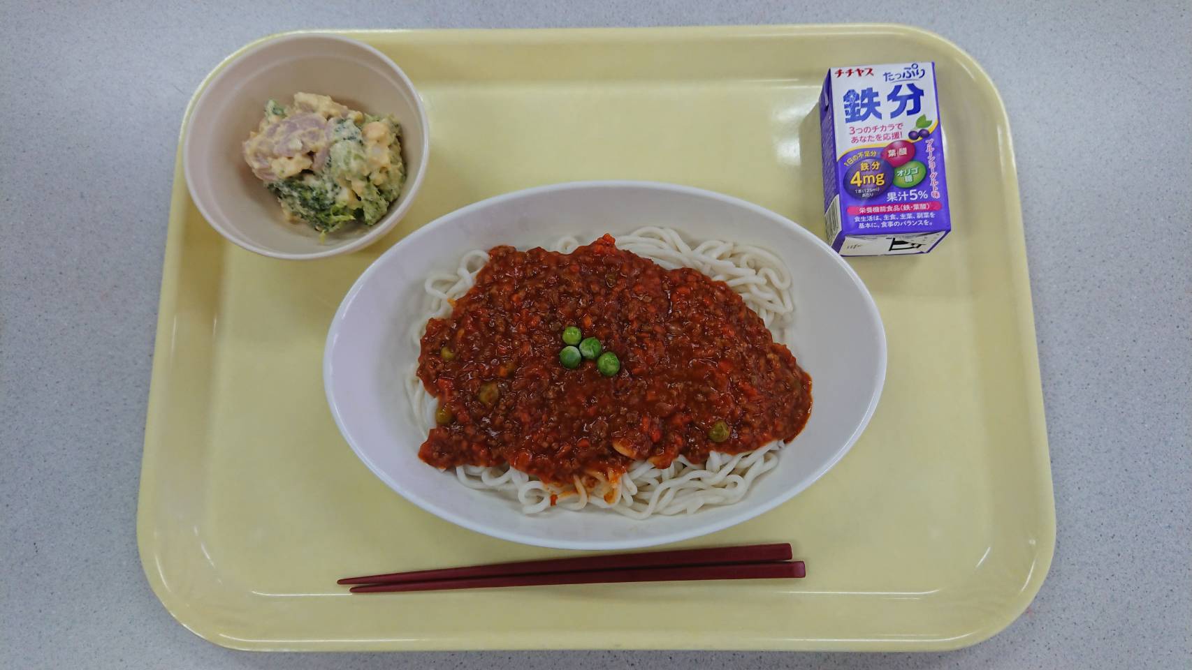 この日のメニューは、ソフト麵ミートソース・たまごサラダ・たっぷり鉄分ジュースでした。
