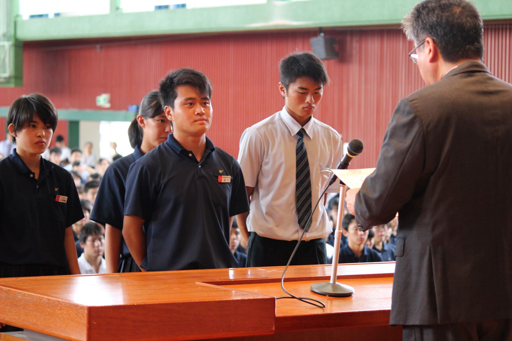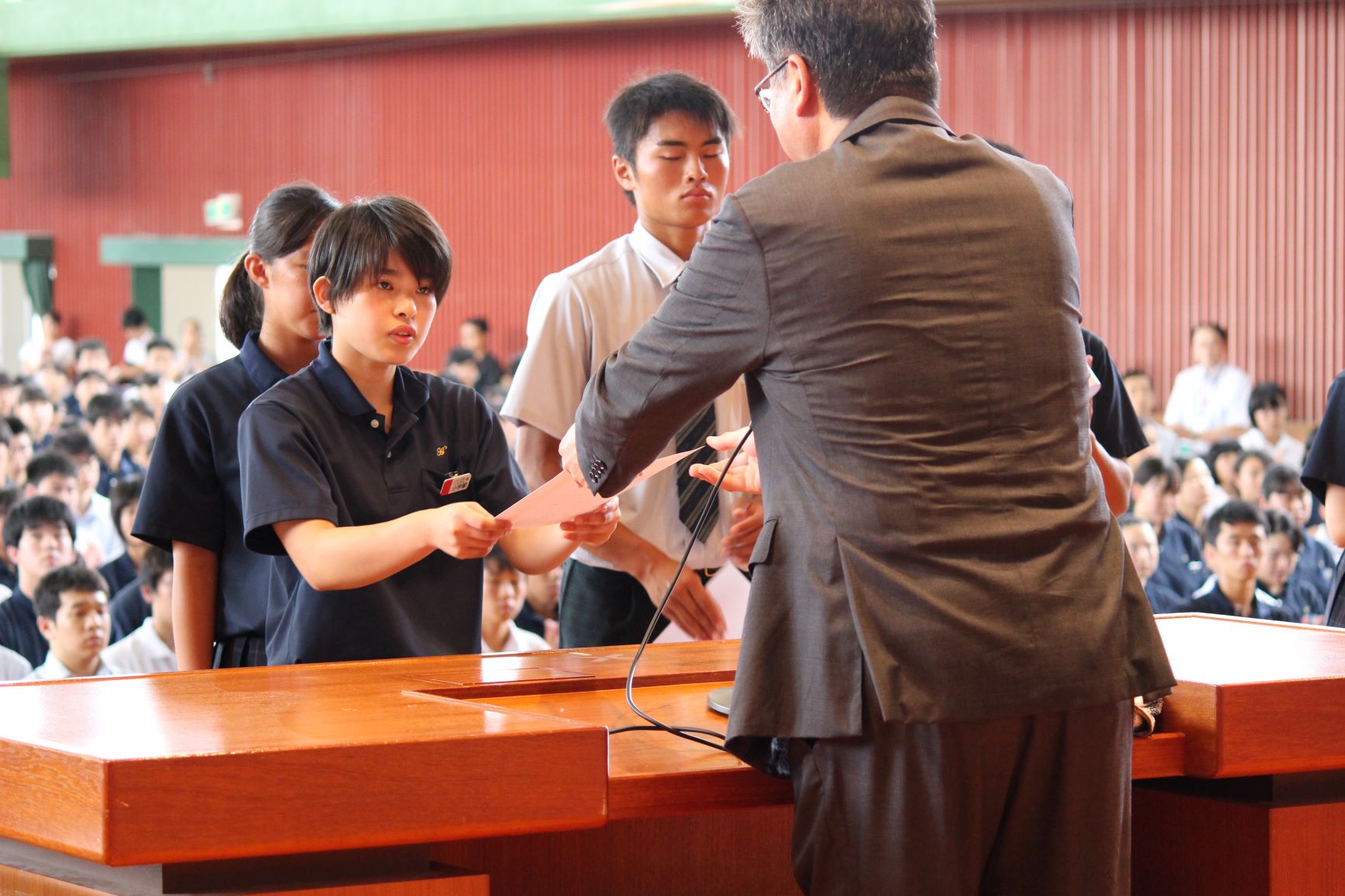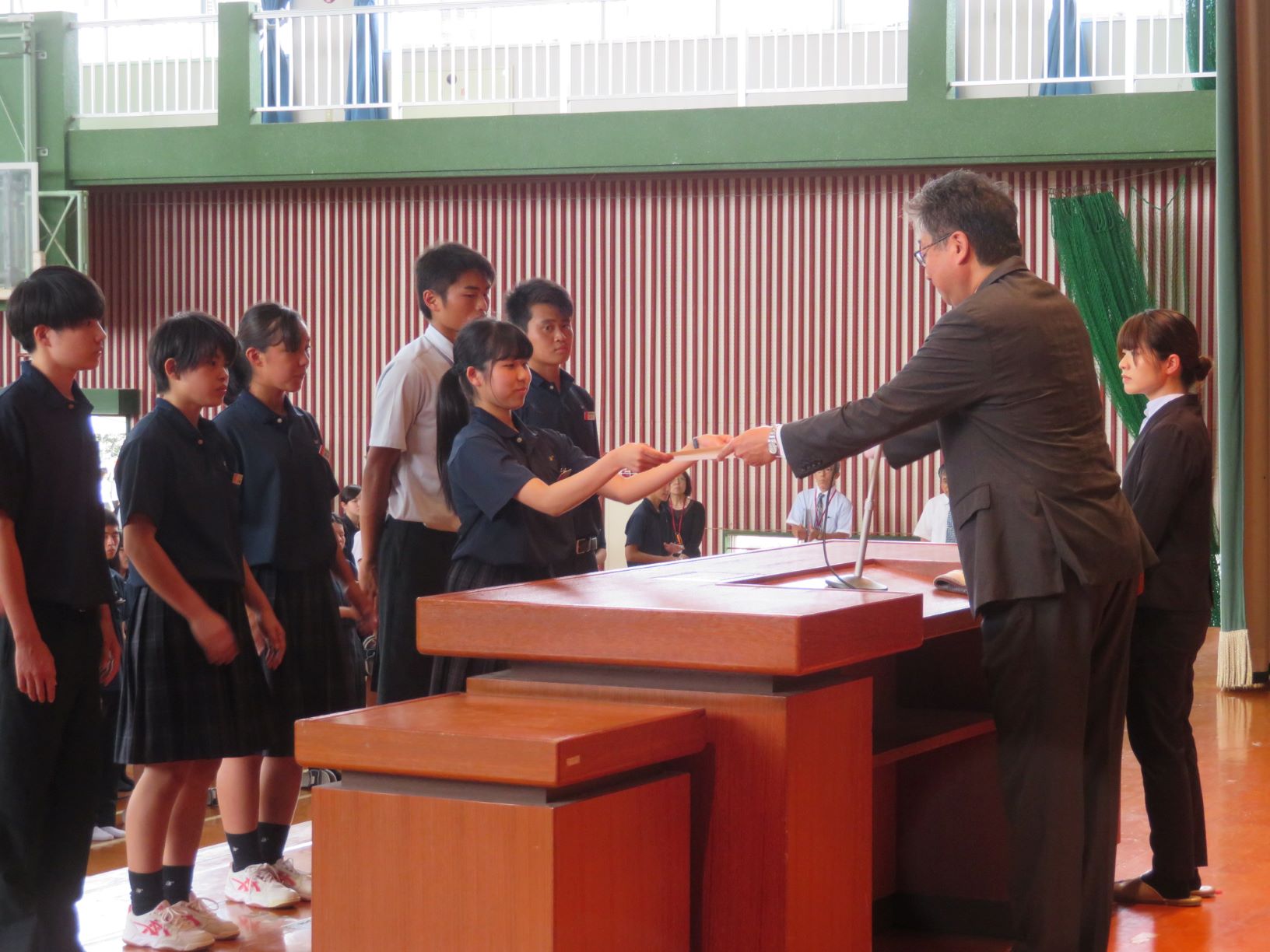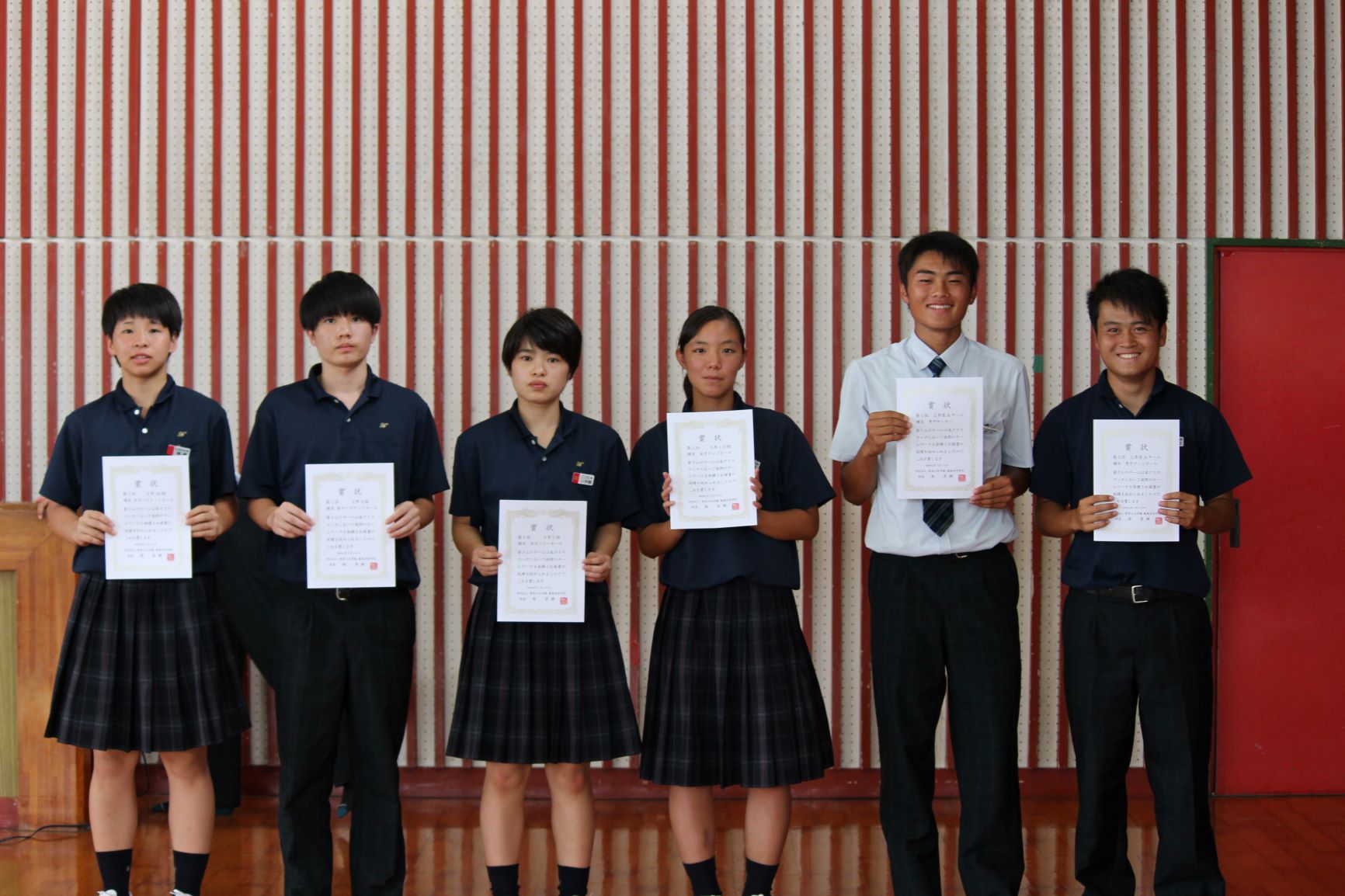 本日は佳作特別賞に入賞した有村美治さん(普通科文理コース3年)が代表で表彰されました。