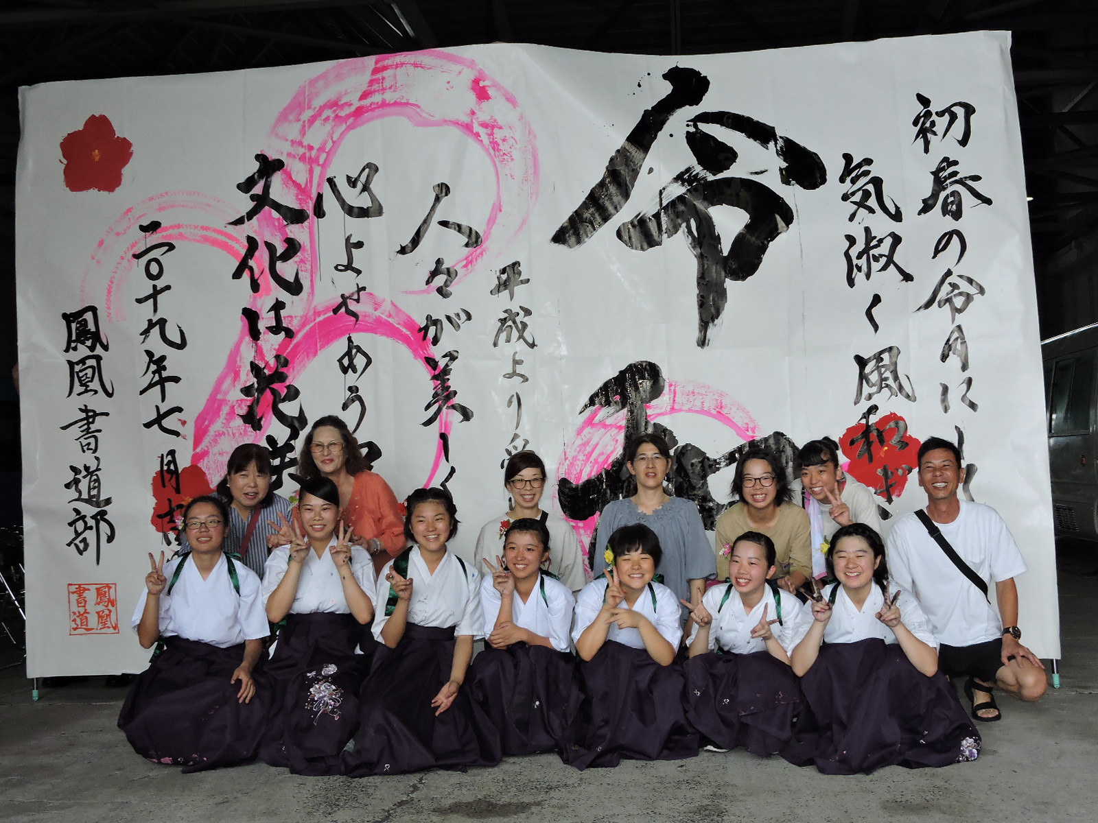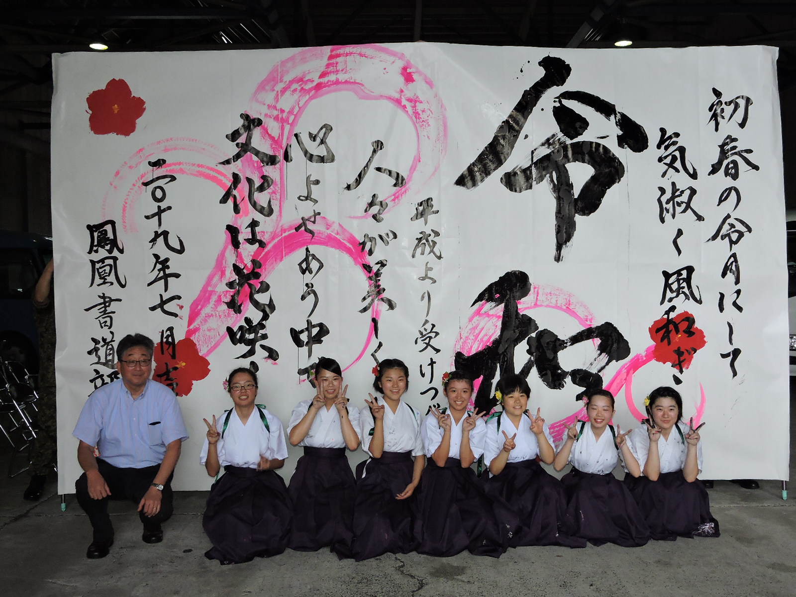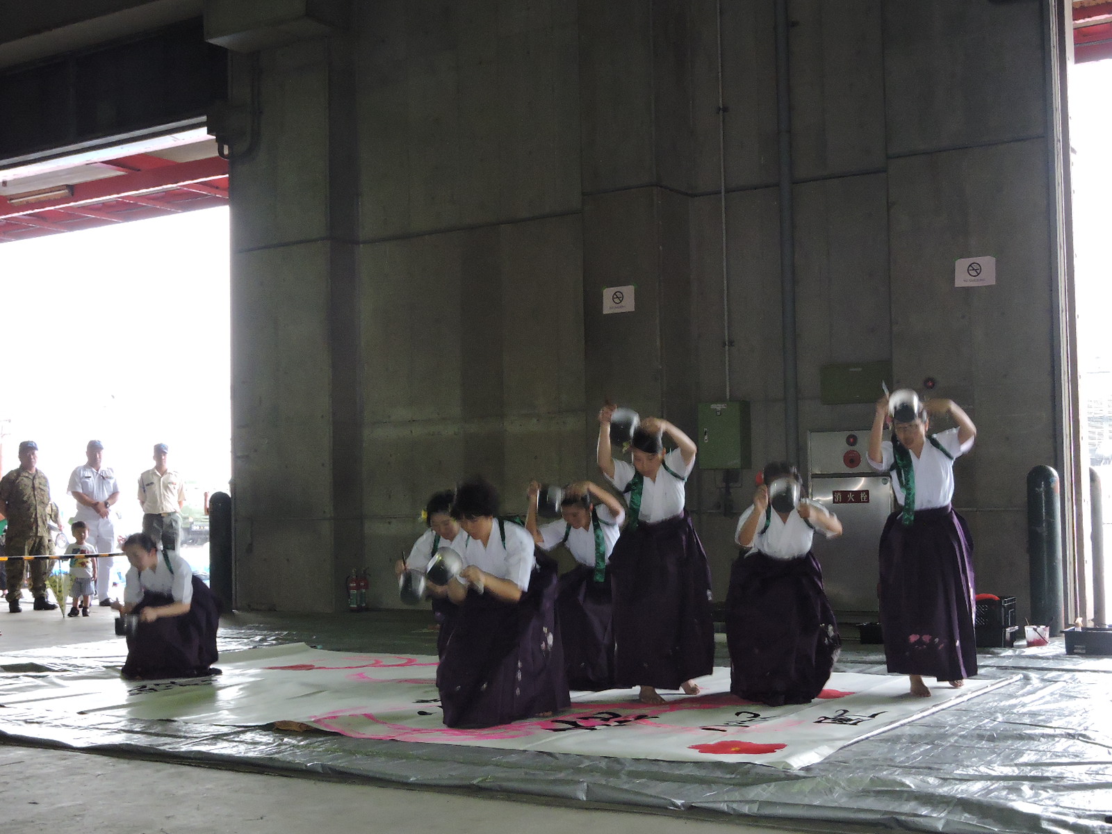去る7/21(日)、鹿児島市の北埠頭で開催された「自衛隊みなと祭り」で、ステージイベントの1つに本校書道部の「書道パフォーマンス」が披露されました。西美継校長はじめ、多くの保護者の方々も駆けつけご声援いただきました。ありがとうございました。