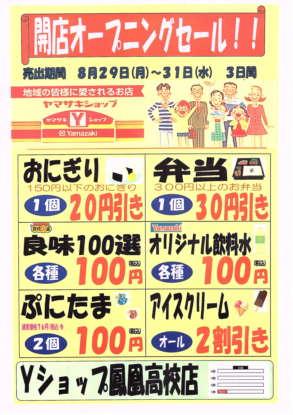 先日もお伝えしたように、8/29(月)にYショップ鳳凰高校店がオープンいたします。