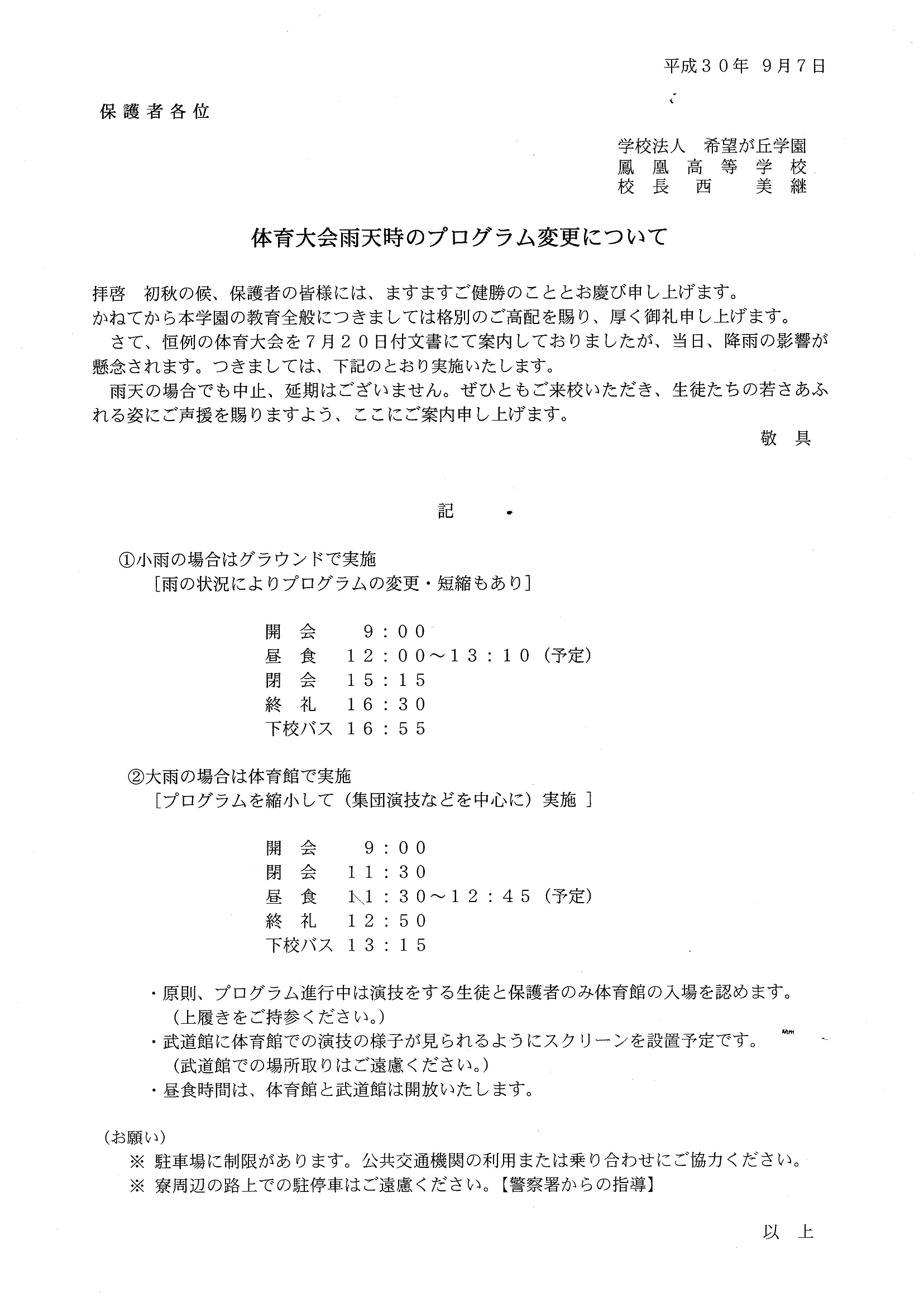 朝から曇り空でした。午前中は予行の手直しで、午後から設営の予定でしたが、時折強い雨があったため武道館や体育館の簡単な設営と掃除を行いました。明日の雨を想定してのことです。運動部を中心によく動いてくれました。1年生は初めての高校体育祭、3年生や専門課程2年生は最後の体育祭となります。しかし……明日の予報は 雨…。なんとか半日でも持ってくれたら…。