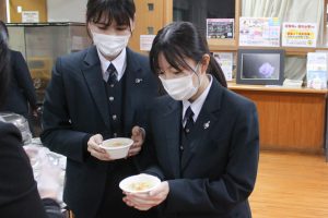 昨日は国家試験に向けての激励弁当の紹介をいたしましたが、実は昨年度末には、身も心もあたたまる豚汁の配布もされておりました。本日はその時の様子をご紹介いたします。