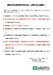 体験入学・出張体験入学に参加される皆さまへお知らせとお願いがあります。熟読していただき、参加当日まで体調管理に努めていただきたいと思います。 なお、小林地区の出張体験入学は新型コロナ感染拡大により中止となりました。また、 […]