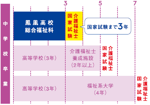 中学卒業後、最短3年で介護福祉士になれるコースです。国家試験合格を目指し、高校1年から専門科目で福祉の基礎を学びます。